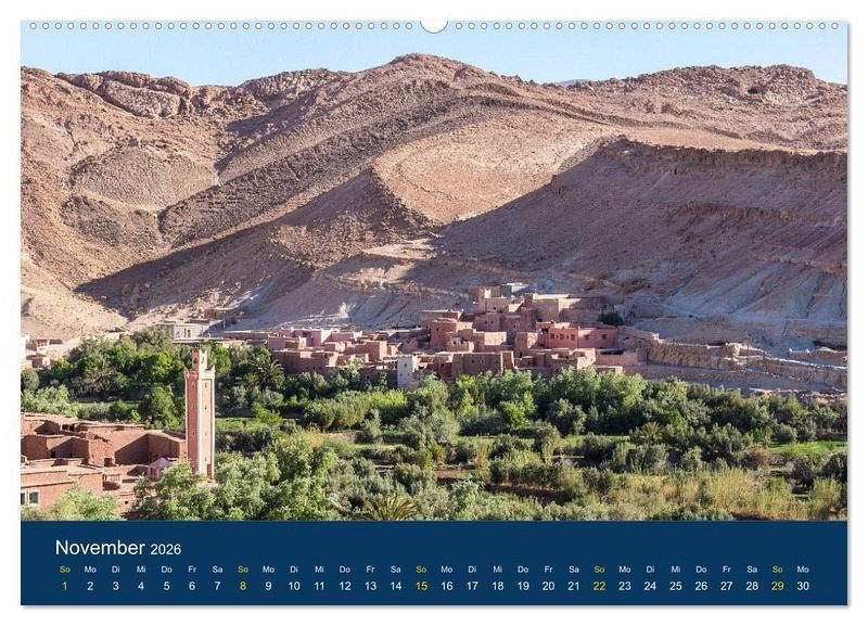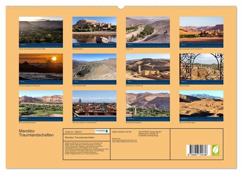Die Fotografin Brigitte Dürr zeigt in diesem Kalender eindrucksvolle Landschaften Marokkos abseits der Touristenpfade, wie Blicke über Berberdörfer, über die Dächer Marrakechs, in Täler des Hohen Atlas.