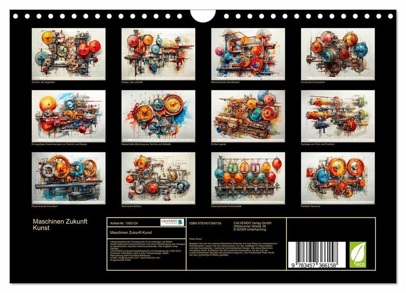 Begeben Sie sich mit unserem Maschinen-Kalender auf eine Reise der mechanischen Wunderwerke! Lassen Sie sich beeindrucken von den vielfältigen Funktionalitäten und dem futuristischen, manchmal minimalistischen Design, das diese Maschinen einzigartig macht. Entdecken Sie die kunstvolle Komposition, bei der sich die unterschiedlichsten Bauteile überraschend ergänzen. Der Fotokünstler Peter Roder hat dazu großartige KI-Bilder gestaltet.