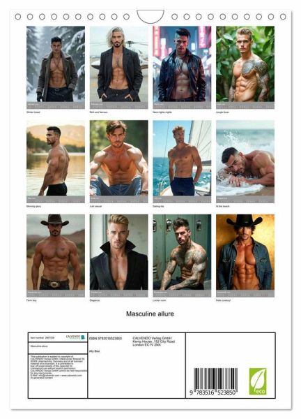 QUALITY - High-quality photo calendar with 12 beautiful images on light-resistant paper, robust spiral binding with hanger.SUSTAINABLE - Significant waste reduction due to print-on-demand production, environmentally friendly FSC-certified paper, produced in the UK, climate-conscious logistical processes.PERFECT GIFT - Calendars for grown-ups - friends and family - and for all occasions, from Christmas to birthdays and everything in between.LOTS OF CHOICE - Wall calendars in different sizes (DIN A4 and DIN A3), for any topic and personal taste, featuring photography, painting and illustrations.a captivating calendar that celebrates the art of masculine beauty, author: Tina Seidel