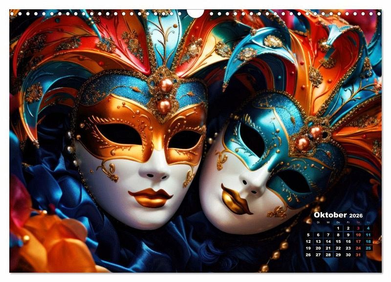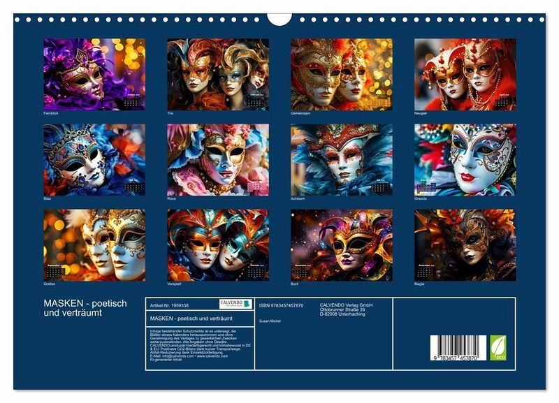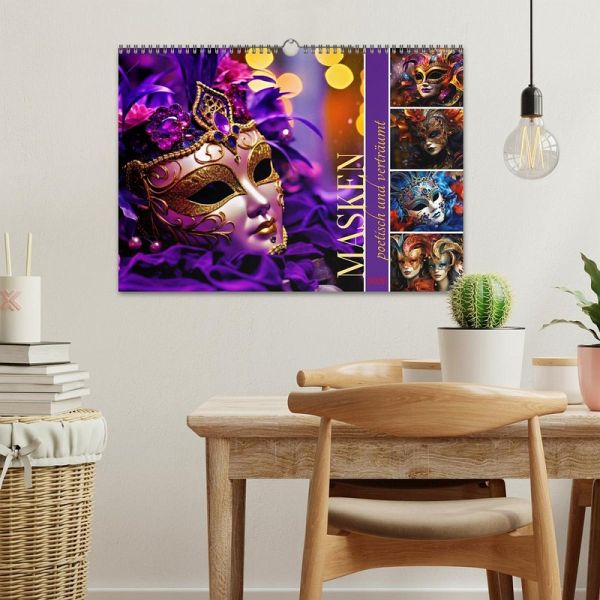 Entdecken Sie die Magie der Masken - ein Spiel aus Verhüllung und Offenbarung, ein Tanz der Poesie auf Ihrem Gesicht. Tauchen Sie ein in den Charme der Verträumtheit und lassen Sie Ihre Persönlichkeit durch diese einzigartigen Kunstwerke strahlen. Tauchen Sie ein in ein Universum voller Eleganz und Mystik, in dem jede Maske eine Geschichte zu erzählen hat. Der Kalender entstand mit Hilfe der KI.