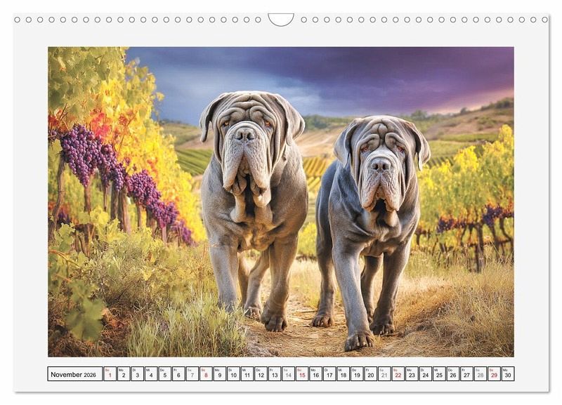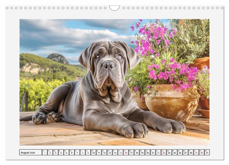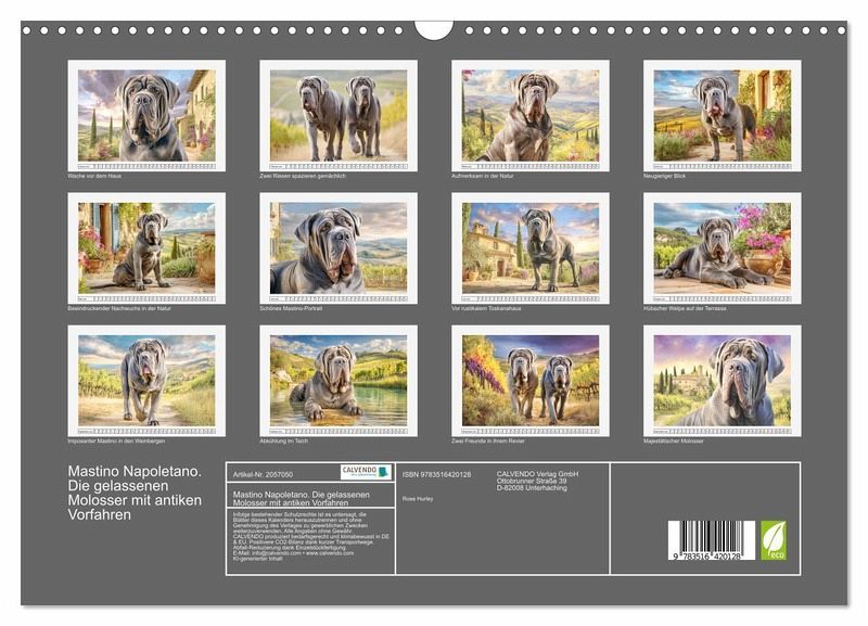Dieser Kalender zeigt beeindruckende Bilder des Mastino Napoletano, einer der ältesten und imposantesten Hunderassen Italiens. Inmitten der sanften Hügel, Zypressen und warmen Farben der Toskana entfaltet sich ihre ganze natürliche Würde. Alle Bilder wurden mit der Hilfe von KI erstellt und zeigen nicht nur ihre körperliche Wucht, sondern auch ihr ruhiges, loyales und tief verbundenes Wesen. Entstanden ist eine Hommage an diese majestätischen Hunde - kraftvoll, edel und imposant.
