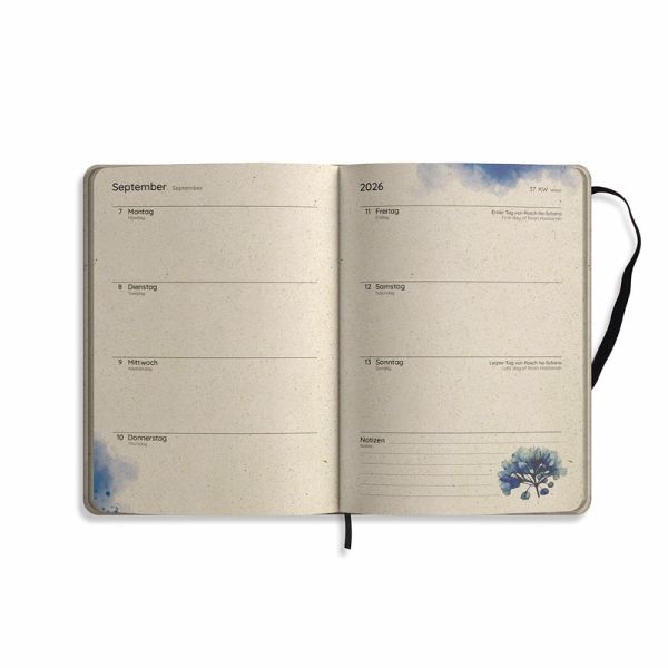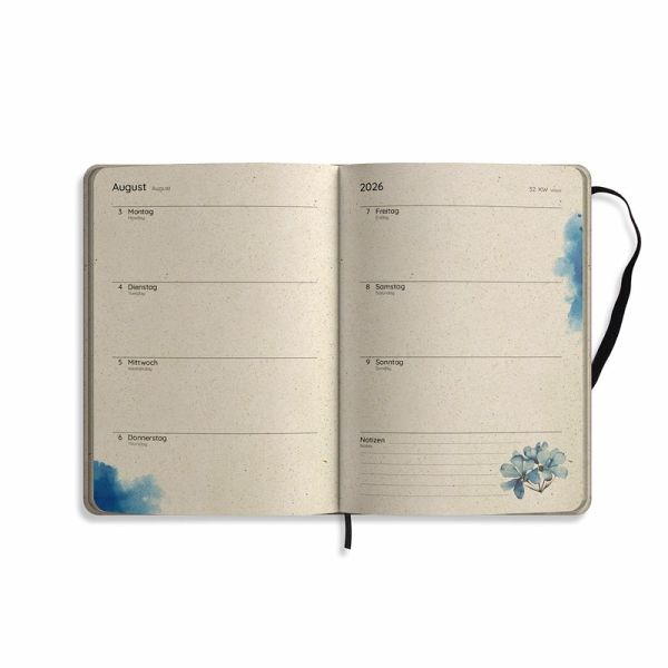 Illustriert von Patishop Art "Samaya" bedeutet "Zeit" in Sanskrit. Mit unseren Jahresplanern wünschen wir dir genau das: Zeit für persönliche Termine, Pläne und Träume für deine Liebsten oder dich selbst. Die ersten V-Label-zertifizierten Bücher Deutschlands! Dieser nachhaltige A5 Kalender 2026 ist zweisprachig (Deutsch/Englisch) und duftet wunderbar nach Gras. So trägst du die besondere Atmosphäre, Schönheit und Ruhe einer Sommerwiese immer bei dir! Der Samaya in der Farbe: Spring Green überzeugt mit seinem wunderschön floralen aquarell Design und einer klar strukturierten Wochenübersicht: Eine Kalenderwoche auf einer Doppelseite sowie viel Platz für Notizen oder um selbst kreativ zu werden. Darüber hinaus ist er mit Feiertagen für Deutschland sowie internationalen Feiertagen ausgestattet. Die praktische Jahresübersicht zeigt das laufende Jahr und erleichtert langfristige Planung. Eine Monatsübersicht inklusive Mondphasen hilft dir, Termine auf einen Blick zu erfassen. Auch die Schulferien für Deutschland, Österreich und die Schweiz sind aufgeführt und ermöglichen so eine verlässliche Planung in schulischen und familienbezogenen Kontexten. Der Pflanzen-Kalender bringt dank seiner Aquarellillustrationen zu jedem Monatsanfang eine farbenfrohe Abwechslung in alle Termine und lässt die Herzen aller Blumenliebhaber:innen aufblühen. Verwendbar als umweltfreundlicher Jahresplaner, Jahreskalender, Kalender, Familienkalender, Notizbuch, Tagebuch, Terminplaner, Achtsamkeitstagebuch, Bullet Journal, Reisetagebuch, Dankbarkeitstagebuch, Hausaufgabenheft, Uni-Planer, Taschenkalender, Buchkalender, Business-Planer, Blumenkalender, botanischer Kalender, Aquarell Kalender, floraler Kalender oder Wochenplaner. Perfekt geeignet als nachhaltiges Geschenk für dich und deine Liebsten. Unsere Papiere sorgen für ein außergewöhnliches Schreibgefühl und lassen sich mit unterschiedlichsten Stiften und Farben beschreiben. Dank seiner natürlichen Robustheit franst Tinte nicht aus und blutet auch nicht auf der Rückseite durch. Ein kurzes Antrocknen lassen sorgt dafür, dass nichts verwischt. Angaben zum Inhalt ¿ Übersicht Schulferien (D, AT, CH) ¿ Jahresübersicht (2026/2027) ¿ Monatsübersicht (2026) inkl. Mondphasen ¿ Voll illustriert mit 12 gestalteten Monatsauftaktseiten ¿ Wochenübersicht Basic (Kalenderwoche auf einer Doppelseite + Platz für Notizen) ¿ Die Wochenübersicht beinhaltet Feiertage (DE + International) ¿ Platz für Notizen und Skizzen (7 Seiten) Technische Angaben ¿ Format A5 ¿ Hardcover mit runden Ecken aus Graspapier (bis zu 50 % Grasfaseranteil, Frischfaseranteil aus FSC-zertifizierten Wäldern) 152 Seiten (inkl. Vor- und Nachsatz) aus 90 g/m² Graspapier ¿ Fadenheftung ¿ Öko-Druckfarben ¿ Mit dem V-Label als vegan ausgezeichnet ¿ OEKO-TEX®-zertifiziertes Lesezeichen und Gummiband ¿ Froschtasche Nicht die passende Wochenaufteilung oder das richtige Format für dich und deinen Alltag? Dann schau dir gern auch unsere anderen Kalender an. Neben den zahlreichen Designs gibt es verschiedene Aufteilungen, um für jeden individuellen Tagesablauf den passenden Jahresplaner zu bieten. matabooks - Made with ¿ in Germany