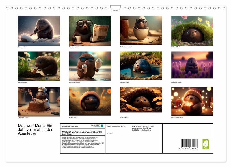 Erlebe ein Jahr voller tierischem Spaß und Humor mit dem Maulwurf Kalender! Begleite den kleinen Nager durch alle vier Jahreszeiten und erlebe witzige Alltagssituationen, kuriose Erlebnisse und verblüffende Maskeraden in amüsanten Illustrationen. Ob als Geschenk für Kinder oder für dich selbst als kreatives Highlight an der Wand. Der Maulwurf Kalender sorgt für gute Laune und lässt dich immer wieder schmunzeln. Mit seinen einzigartigen Bildmontagen und Momentaufnahmen zeigt der Maulwurf Kalender, dass auch in der Natur jede Menge Spaß stecken kann. Hol dir jetzt den Maulwurf Kalender und erlebe ein Jahr voller tierischer Abenteuer und witzigen Einfällen!