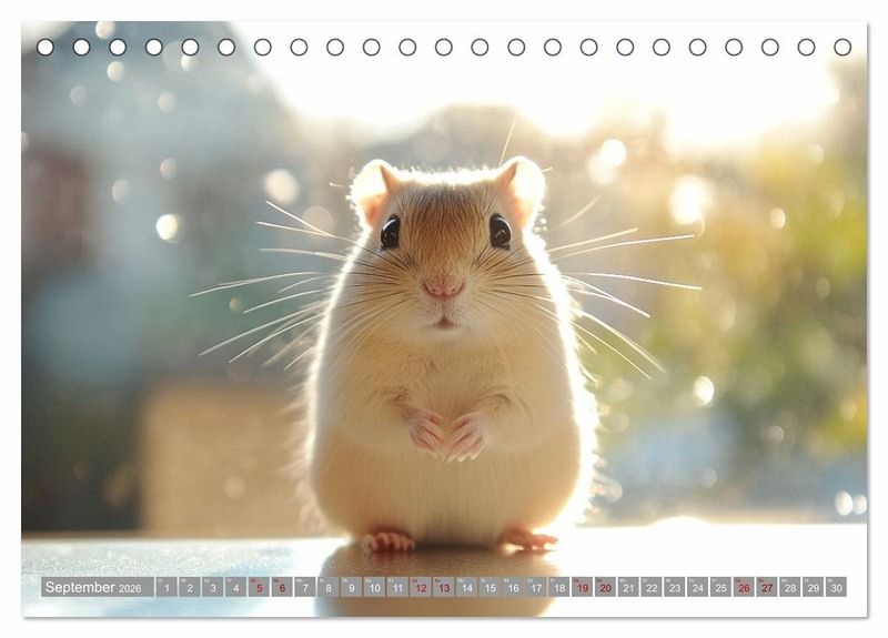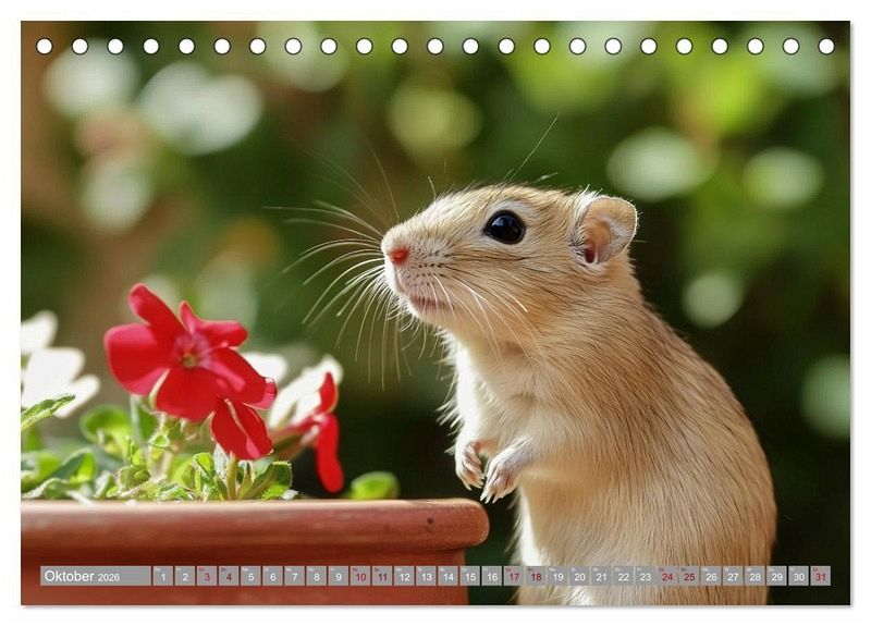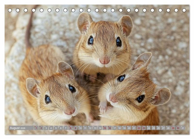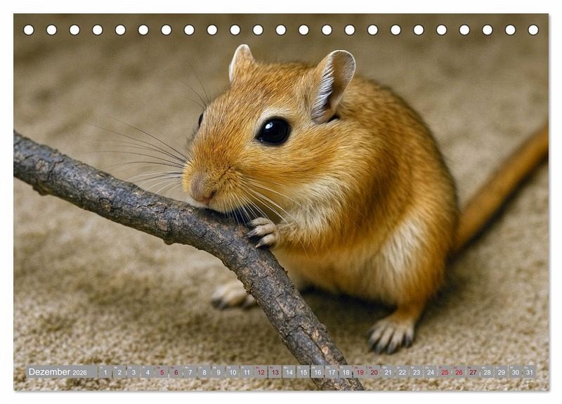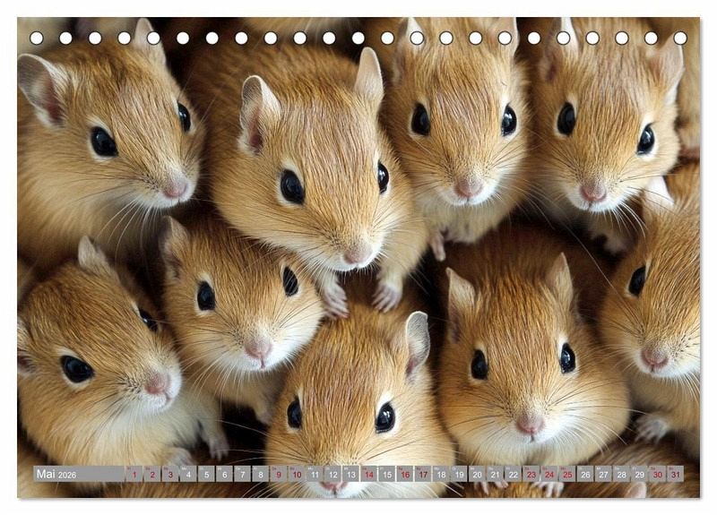 Dieser außergewöhnliche Kalender zeigt Gerbils - auch Rennmäuse oder Mongolische Wüstenrennmäuse genannt - in witzigen, fantasievollen Szenen. Die Bilder wurden mit Hilfe künstlicher Intelligenz erstellt und feiern das Leben dieser flinken Fellfreunde mit Augenzwinkern und Detailverliebtheit. Ein Jahr voller Tempo, Fröhlichkeit und neugierigen Blicken.