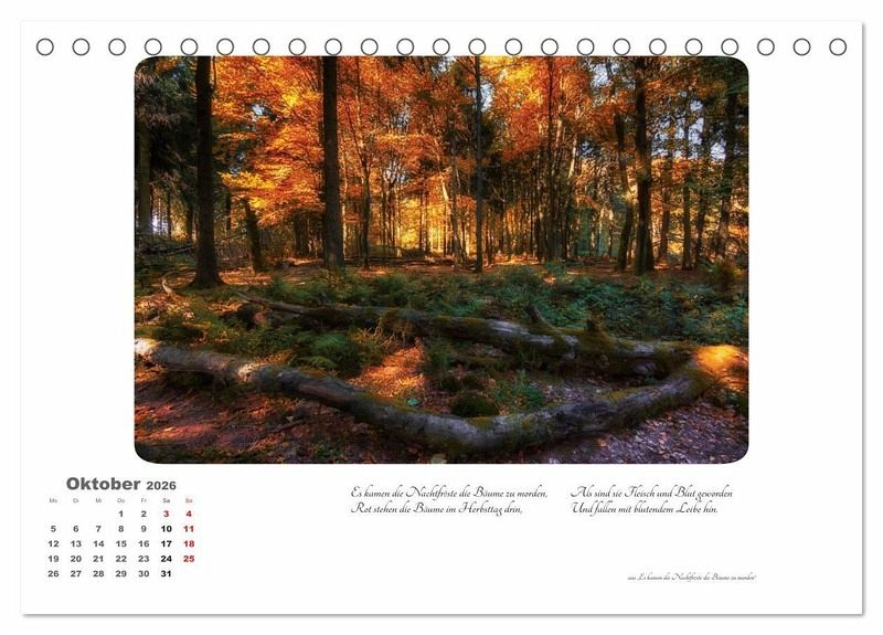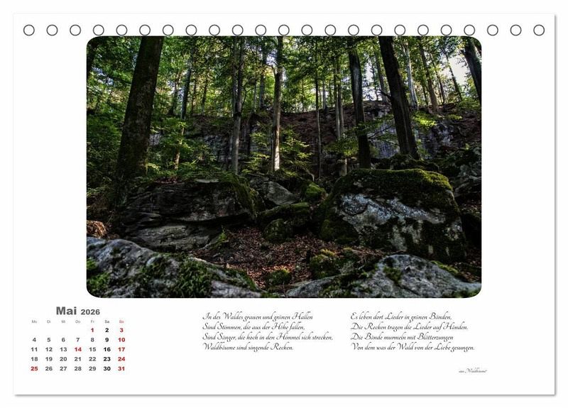 Der Würzburger Dichter Max Dauthendey gilt als Lyriker, der mit Worten malt, dessen Sprache wie Musik klingt. Was liegt also näher als diese poetischen Reime von Bildern begleiten zu lassen. In diesem Kalender werden Gedichte oder Gedichtauszüge von dazu passenden Waldbildern ergänzt, abgestimmt auf die Jahreszeit.