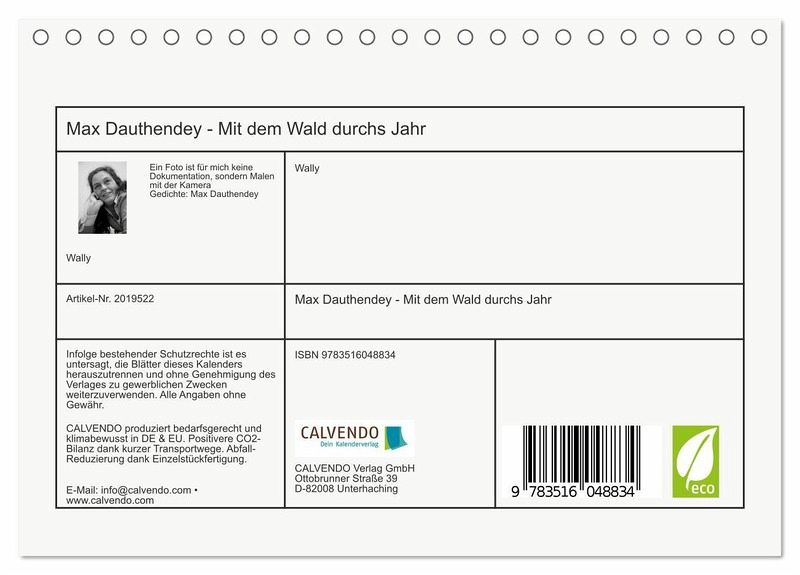 QUALITÄT - Hochwertiger Fotokalender mit 12 wunderschönen Motiven auf lichtbeständigem Bilderdruckpapier, robuste Spiralbindung.NACHHALTIG - deutliche Abfallreduzierung durch bedarfsgerechte Einzelstückfertigung, umweltfreundliches FSC-zertifiziertes Papier, Produktion in Deutschland, klimabewusste Logistik.PERFEKTES GESCHENK - Kalender für Freunde und Familie, für Kinder und Erwachsene, jung und alt, zu Weihnachten, Geburtstag oder zwischendurch.VIELFALT - Bildkalender in verschiedenen Formaten, z.B. DIN A5, DIN A4, DIN A3 sowie DIN A2. Ob Naturmotiv, Gemälde oder Fotos, ideal für ein persönliches Wohlfühlambiente.Die impressionistische Lyrik Max Dauthendeys in Waldbildern umgesetzt von Autor(in): Wally