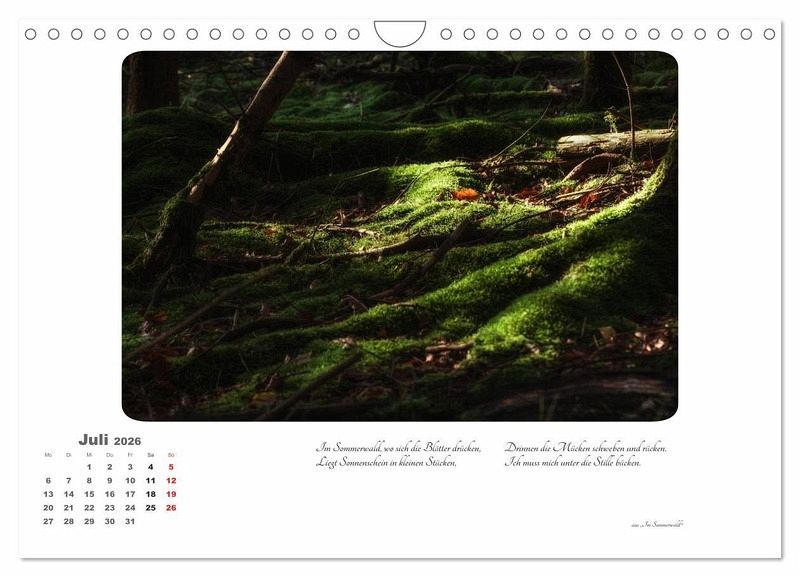 Der Würzburger Dichter Max Dauthendey gilt als Lyriker, der mit Worten malt, dessen Sprache wie Musik klingt. Was liegt also näher als diese poetischen Reime von Bildern begleiten zu lassen. In diesem Kalender werden Gedichte oder Gedichtauszüge von dazu passenden Waldbildern ergänzt, abgestimmt auf die Jahreszeit.