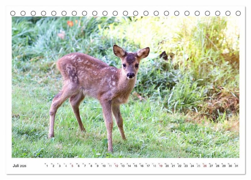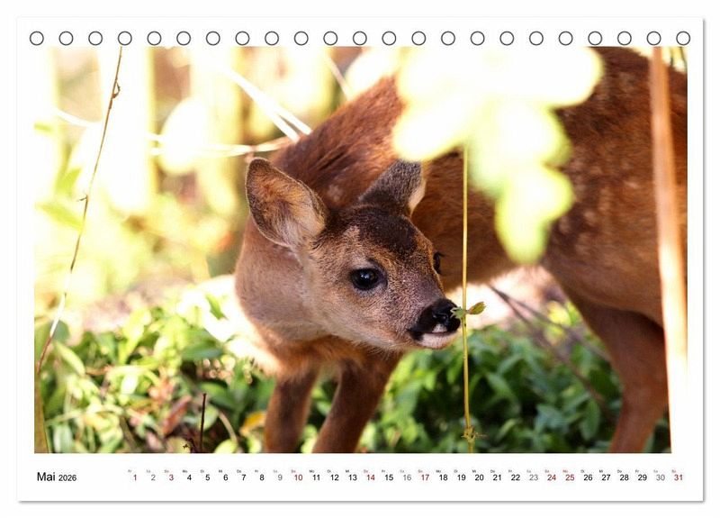 Rehe bringen normalerweise im Wonnemonat Mai ihre Kitze zur Welt, niedliche Tierkinder mit großen Augen, zum Verlieben süß. Der kleine Rehbock Max ist im August geboren, was sehr ungewöhnlich ist. Weil die Ricke ihn nicht versorgte, hat sich die Fotografin als Rehkitzretterin betätigt und ihn aufgezogen. Wunderschöne Aufnahmen entstanden in ihrem Garten, die Sie jeden Monat aufs Neue erfreuen werden.