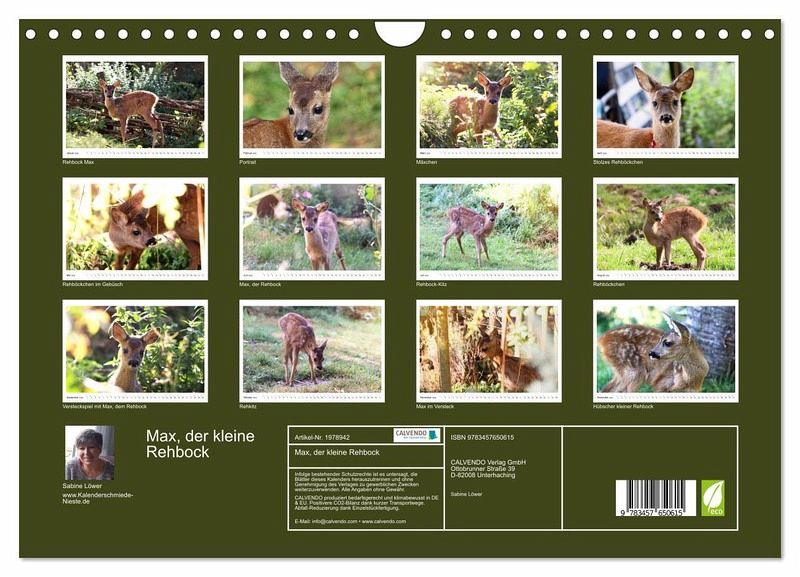 QUALITÄT - Hochwertiger Fotokalender mit 12 wunderschönen Motiven auf lichtbeständigem Bilderdruckpapier, robuste Spiralbindung mit Aufhängebügel.NACHHALTIG - deutliche Abfallreduzierung durch bedarfsgerechte Einzelstückfertigung, umweltfreundliches FSC-zertifiziertes Papier, Produktion in Deutschland, klimabewusste Logistik.PERFEKTES GESCHENK - Kalender für Freunde und Familie, für Kinder und Erwachsene, jung und alt, zu Weihnachten, Geburtstag oder zwischendurch.VIELFALT - Bildkalender in verschiedenen Formaten, z.B. DIN A5, DIN A4, DIN A3 sowie DIN A2. Ob Naturmotiv, Gemälde oder Fotos, ideal für ein persönliches Wohlfühlambiente.Bezaubernde Fotos des kleinen Rehböckchens Max von Autor(in): Sabine Löwer