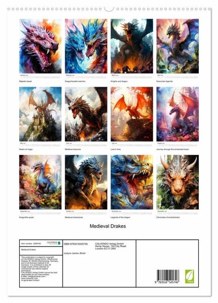PREMIUM COLLECTION - Brilliant photo calendar with 12 beautiful motifs, high-gloss art print in museum quality.QUALITY - high-quality materials, sturdy back cover with 2 innovative insert pockets for optimum presentation on the wall.SUSTAINABLE - significant reduction in waste thanks to customised one-off production, environmentally friendly FSC-certified paper, production in Germany, climate-conscious logistics.PERFECT GIFT - calendars for friends and family, for children and adults, young and old, for Christmas, birthdays or in between.Embark on a mystical journey through the medieval realms with our enchanting dragon themed fantasy calendar Medieval Drakes, featuring captivating digital artwork. von Autor(in): JBJart