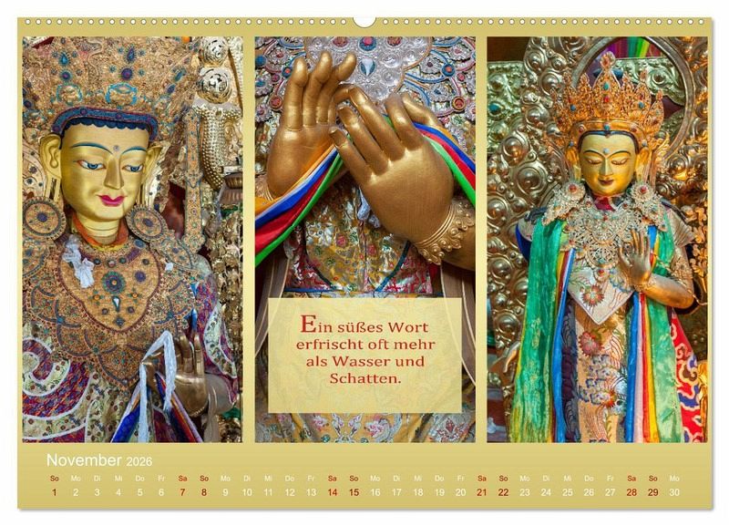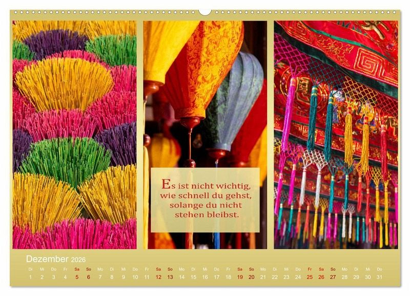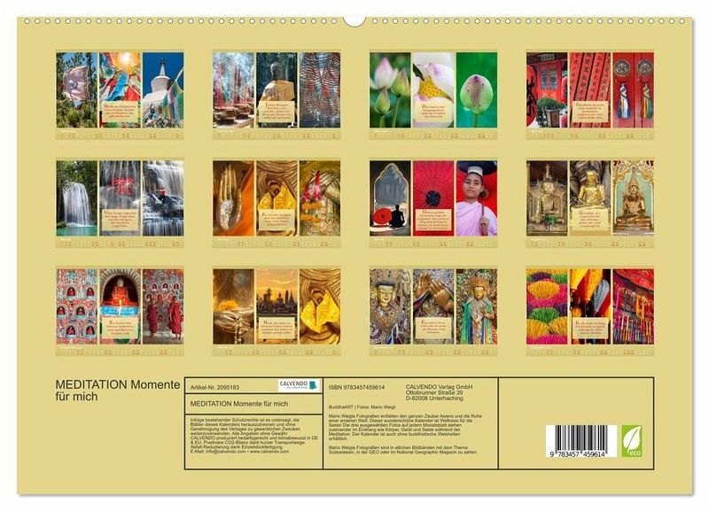 Die Fotografien entfalten den ganzen Zauber Asiens und die Ruhe einer anderen Welt. Dieser wunderschöne Kalender ist Wellness für die Seele! Die drei ausgewählten Fotos auf jedem Monatsblatt stehen zueinander im Einklang wie Körper, Geist und Seele während der Meditation.