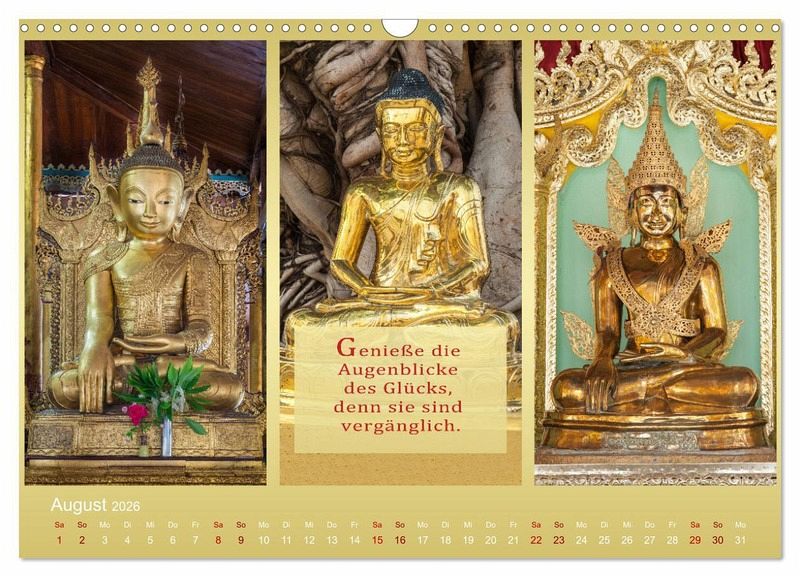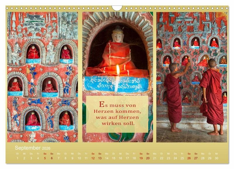 Die Fotografien entfalten den ganzen Zauber Asiens und die Ruhe einer anderen Welt. Dieser wunderschöne Kalender ist Wellness für die Seele! Die drei ausgewählten Fotos auf jedem Monatsblatt stehen zueinander im Einklang wie Körper, Geist und Seele während der Meditation.