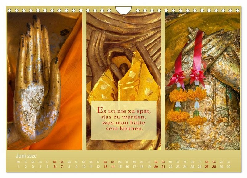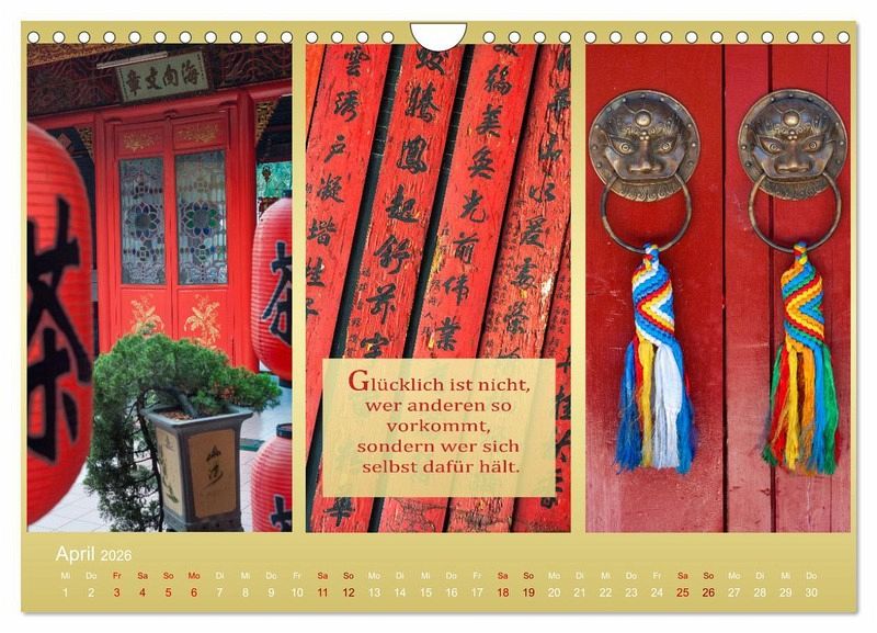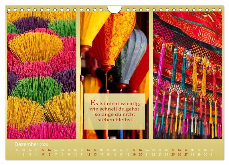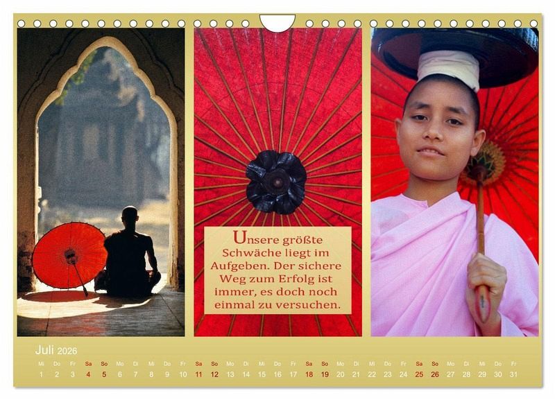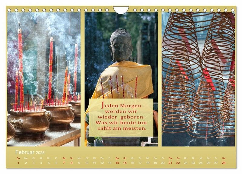 Die Fotografien entfalten den ganzen Zauber Asiens und die Ruhe einer anderen Welt. Dieser wunderschöne Kalender ist Wellness für die Seele! Die drei ausgewählten Fotos auf jedem Monatsblatt stehen zueinander im Einklang wie Körper, Geist und Seele während der Meditation.