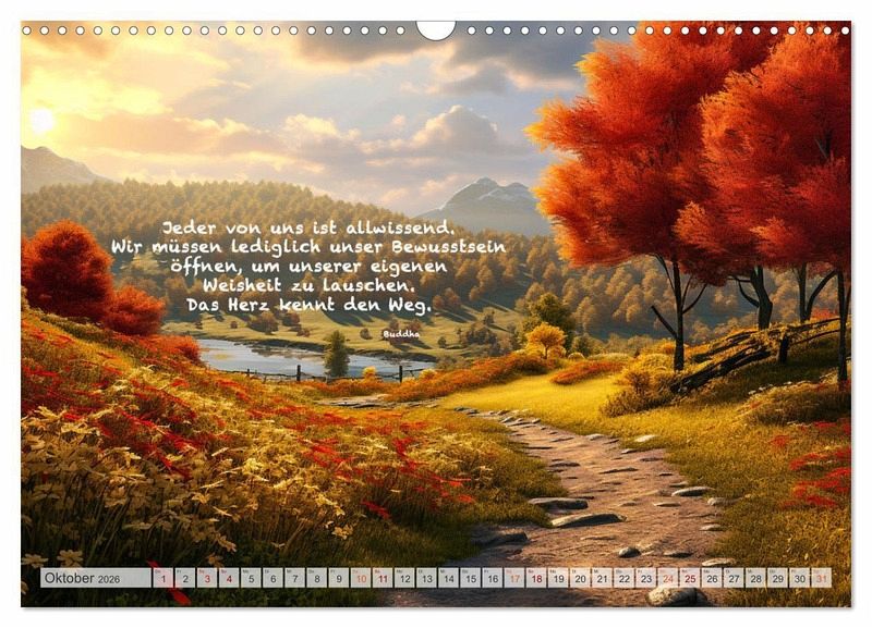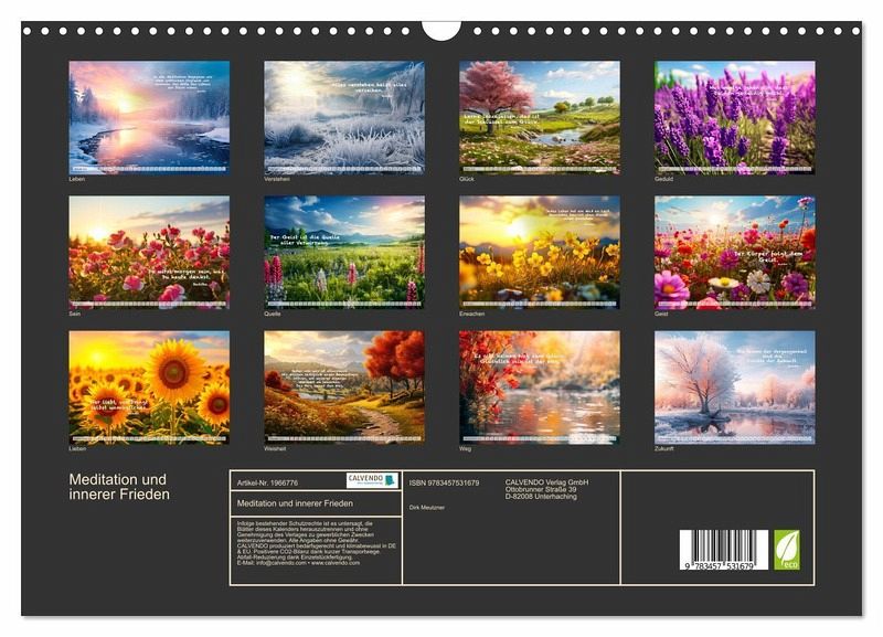 Die Bilder des Fotografen Dirk Meutzner entfalten den ganzen Zauber der Natur und die Ruhe unserer Welt. Dieser wunderschöne Kalender enthält nachdenkliche und weiße Sprüche von Buddha, damit können Sie ihren inneren Frieden finden und wunderbar meditieren. Dieser Kalender eignet sich auch hervorragend als Geschenk für Ihre Freunde und Verwandten. Erstellt wurden die Bilder mit KI und Photoshop.