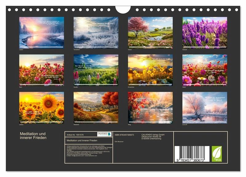 Die Bilder des Fotografen Dirk Meutzner entfalten den ganzen Zauber der Natur und die Ruhe unserer Welt. Dieser wunderschöne Kalender enthält nachdenkliche und weiße Sprüche von Buddha, damit können Sie ihren inneren Frieden finden und wunderbar meditieren. Dieser Kalender eignet sich auch hervorragend als Geschenk für Ihre Freunde und Verwandten. Erstellt wurden die Bilder mit KI und Photoshop.