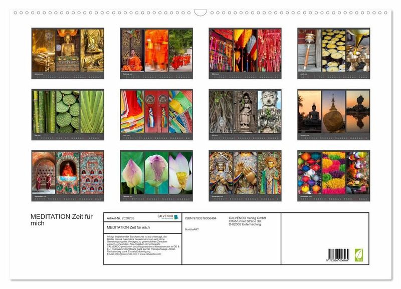 In der Ruhe liegt die Kraft! Die drei Fotografien auf jedem Kalenderblatt stehen zueinander im Einklang wie Körper, Geist und Seele während der Meditation. Die Fotografien von BuddhaART helfen dem Betrachter nach einem ereignisreichen Tag wieder Ruhe zu finden. Dieser wunderschöne Kalender ist Wellness für die Seele!
