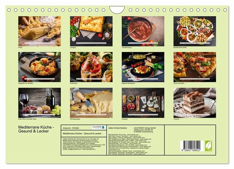 QUALITÄT - Hochwertiger Fotokalender mit 12 wunderschönen Motiven auf lichtbeständigem Bilderdruckpapier, robuste Spiralbindung mit Aufhängebügel.NACHHALTIG - deutliche Abfallreduzierung durch bedarfsgerechte Einzelstückfertigung, umweltfreundliches FSC-zertifiziertes Papier, Produktion in Deutschland, klimabewusste Logistik.PERFEKTES GESCHENK - Kalender für Freunde und Familie, für Kinder und Erwachsene, jung und alt, zu Weihnachten, Geburtstag oder zwischendurch.VIELFALT - Bildkalender in verschiedenen Formaten, z.B. DIN A5, DIN A4, DIN A3 sowie DIN A2. Ob Naturmotiv, Gemälde oder Fotos, ideal für ein persönliches Wohlfühlambiente.Wunderschöne Bilder von leckeren Mediterranen Speisen begleiten uns durch das Jahr. von Autor(in): Gunter Kirsch