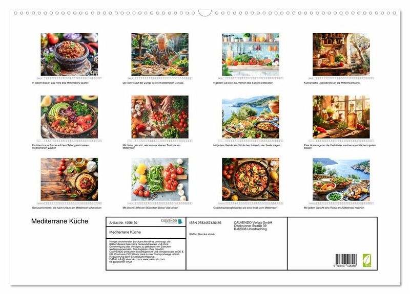 QUALITÄT - Hochwertiger Fotokalender mit 12 wunderschönen Motiven auf lichtbeständigem Bilderdruckpapier, robuste Spiralbindung mit Aufhängebügel.NACHHALTIG - deutliche Abfallreduzierung durch bedarfsgerechte Einzelstückfertigung, umweltfreundliches FSC-zertifiziertes Papier, Produktion in Deutschland, klimabewusste Logistik.PERFEKTES GESCHENK - Kalender für Freunde und Familie, für Kinder und Erwachsene, jung und alt, zu Weihnachten, Geburtstag oder zwischendurch.VIELFALT - Bildkalender in verschiedenen Formaten, z.B. DIN A5, DIN A4, DIN A3 sowie DIN A2. Ob Naturmotiv, Gemälde oder Fotos, ideal für ein persönliches Wohlfühlambiente.Kommen Sie mit auf eine kulinarische Reise durch die sonnenverwöhnten Küsten des Mittelmeers! Unsere mediterrane Küche ist eine Hommage an die reiche Vielfalt dieser Region, die durch ihre Zutaten inspiriert ist. von Autor(in): Steffen Gierok ; Magik Artist Design