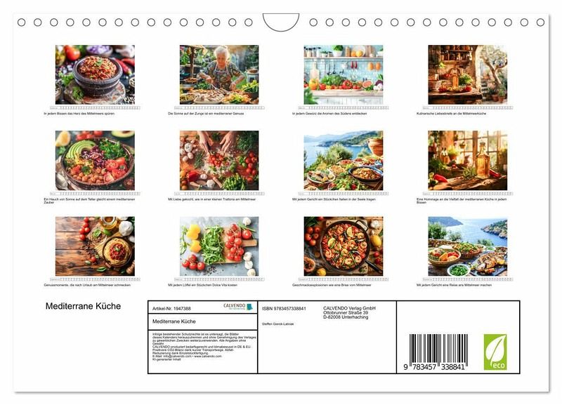 QUALITÄT - Hochwertiger Fotokalender mit 12 wunderschönen Motiven auf lichtbeständigem Bilderdruckpapier, robuste Spiralbindung mit Aufhängebügel.NACHHALTIG - deutliche Abfallreduzierung durch bedarfsgerechte Einzelstückfertigung, umweltfreundliches FSC-zertifiziertes Papier, Produktion in Deutschland, klimabewusste Logistik.PERFEKTES GESCHENK - Kalender für Freunde und Familie, für Kinder und Erwachsene, jung und alt, zu Weihnachten, Geburtstag oder zwischendurch.VIELFALT - Bildkalender in verschiedenen Formaten, z.B. DIN A5, DIN A4, DIN A3 sowie DIN A2. Ob Naturmotiv, Gemälde oder Fotos, ideal für ein persönliches Wohlfühlambiente.Kommen Sie mit auf eine kulinarische Reise durch die sonnenverwöhnten Küsten des Mittelmeers! Unsere mediterrane Küche ist eine Hommage an die reiche Vielfalt dieser Region, die durch ihre Zutaten inspiriert ist. von Autor(in): Steffen Gierok ; Magik Artist Design