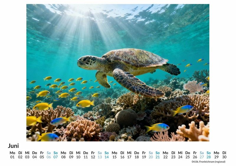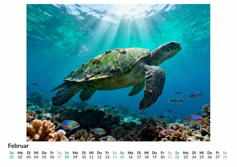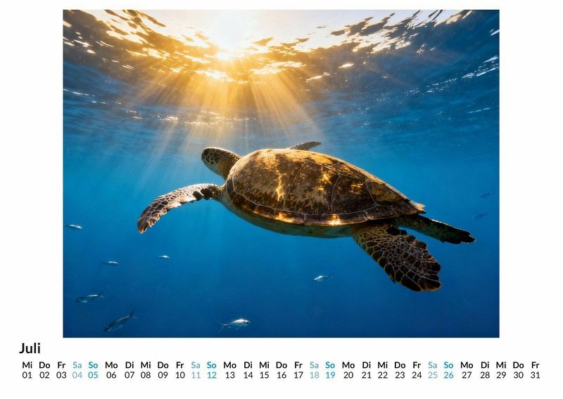Seit Millionen von Jahren durchqueren sie die Ozeane, stille und würdevolle Reisende der Zeit. Meeresschildkröten sind lebende Zeugen der Erdgeschichte und gelten in vielen Kulturen als Symbole für Weisheit, Schutz und ein langes Leben. Der Kalender "Meeresschildkröten" fängt die ruhige und beständige Natur dieser faszinierenden Meeresbewohner in zwölf einzigartigen Monatsmotiven ein, die zum Innehalten anregen. Dieser Kalender ist eine passende Wahl: * Für Liebhaber der Meereswelt und ihrer Bewohner. * Für Menschen, die in der Symbolik von Langlebigkeit und Gelassenheit Inspiration finden. * Für alle, die eine ruhige und beständige Atmosphäre in ihren Alltag bringen möchten. Jeder Monat präsentiert eine andere Facette dieser urzeitlichen Tiere in ihrer natürlichen Umgebung. Von der majestätischen Lederschildkröte in der tiefblauen See bis zur jungen Suppenschildkröte, die sich ihren Weg durch sonnendurchflutetes, klares Wasser bahnt. Die Motive zeigen die Tiere in verschiedenen Umgebungen und Stimmungen, mal nachdenklich am Meeresgrund ruhend, mal kraftvoll durch die Wellen gleitend. Diese Motive wurden durch digitale Algorithmen zum Leben erweckt und bieten eine besondere Sicht auf die Welt der Meeresschildkröten, die über eine reine Fotografie hinausgeht. Der Kauf dieses Kalenders verspricht: * Zwölf Monatsblätter mit Motiven von Meeresschildkröten. * Ein praktisches Kalendarium für die Organisation des Jahres. * Ein Begleiter durch das Jahr, der an die Werte Beständigkeit und Weisheit erinnert. Der Kalender "Meeresschildkröten" ist mehr als nur ein Zeitplaner. Er ist eine tägliche Erinnerung an die Ruhe und die Kraft, die in der Natur verborgen liegen. Eine Einladung, die zeitlose Eleganz dieser besonderen Tiere Monat für Monat zu entdecken.
