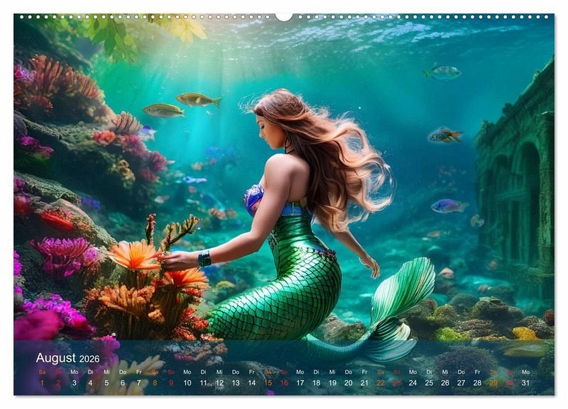 Tauche ein in die magische Welt der Meerjungfrauen mit unserem exklusiven Kalender. Dieses Projekt wurde mit Hilfe modernster Künstlicher Intelligenz (KI) erstellt, um das Leben der geheimnisvollen Wesen auf einzigartige Weise darzustellen. Erlebe die atemberaubende Kulisse von verborgenen Burgruinen und Schiffswracks, die die Geschichten der vergangenen Zeiten erzählen.