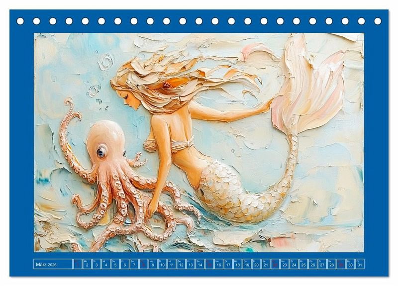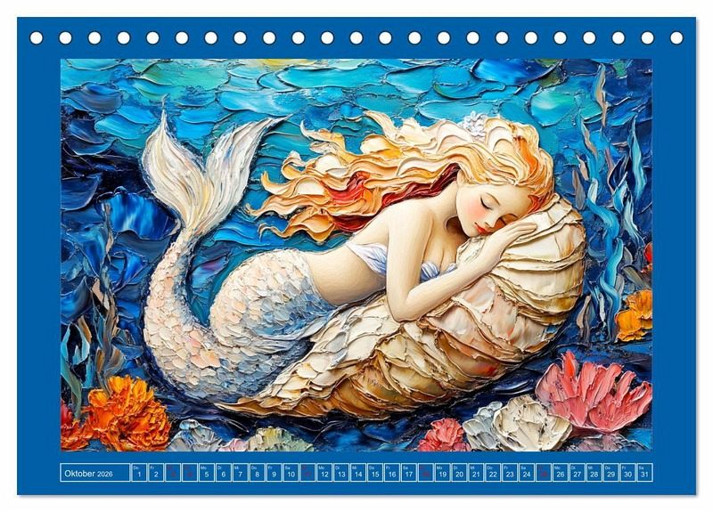 Entdecke die liebliche Schönheit der Unterwasserwelt mit diesen schönen Meerjungfrauen. Jeder Monat zeigt ein buntes Bild einer lieblichen Nixe im Ölgemälde-Stil. Tauche ein in eine Wunderwelt voller Leben und lass dich von den Farben, den träumerischen Details und den geheimnisvollen Hintergründen verzaubern. Alle Illustrationen wurden mit Hilfe von KI generiert, und zeigen das ganze Jahr über anmutige und ätherische Schönheiten.