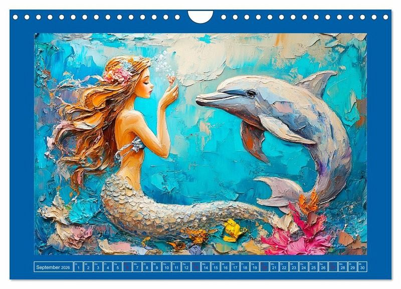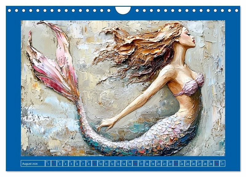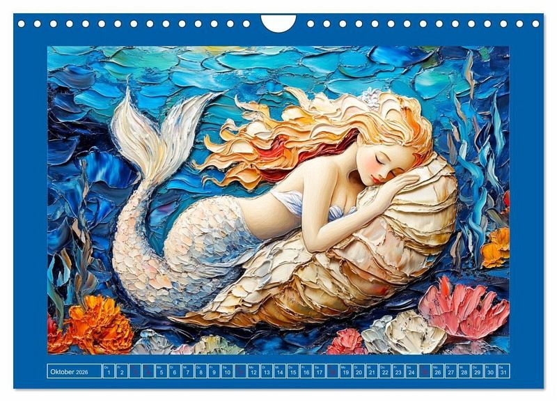 Entdecke die liebliche Schönheit der Unterwasserwelt mit diesen schönen Meerjungfrauen. Jeder Monat zeigt ein buntes Bild einer lieblichen Nixe im Ölgemälde-Stil. Tauche ein in eine Wunderwelt voller Leben und lass dich von den Farben, den träumerischen Details und den geheimnisvollen Hintergründen verzaubern. Alle Illustrationen wurden mit Hilfe von KI generiert, und zeigen das ganze Jahr über anmutige und ätherische Schönheiten.