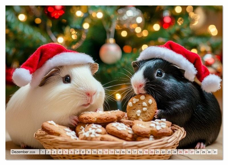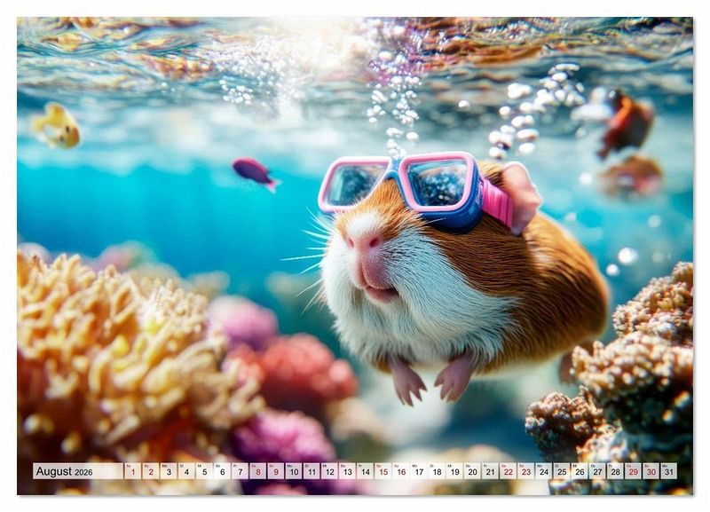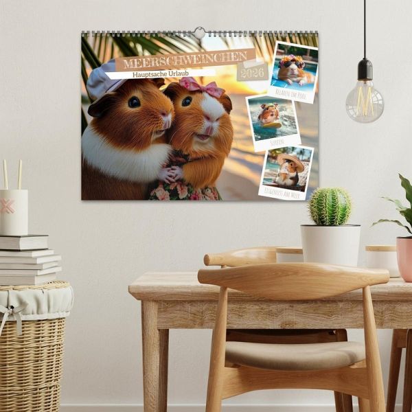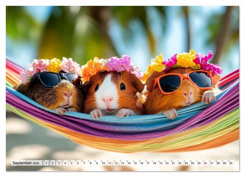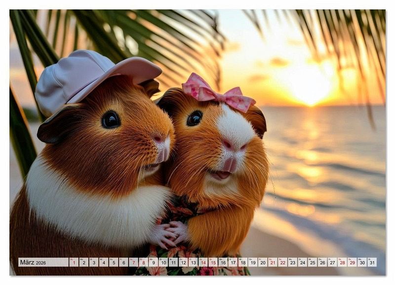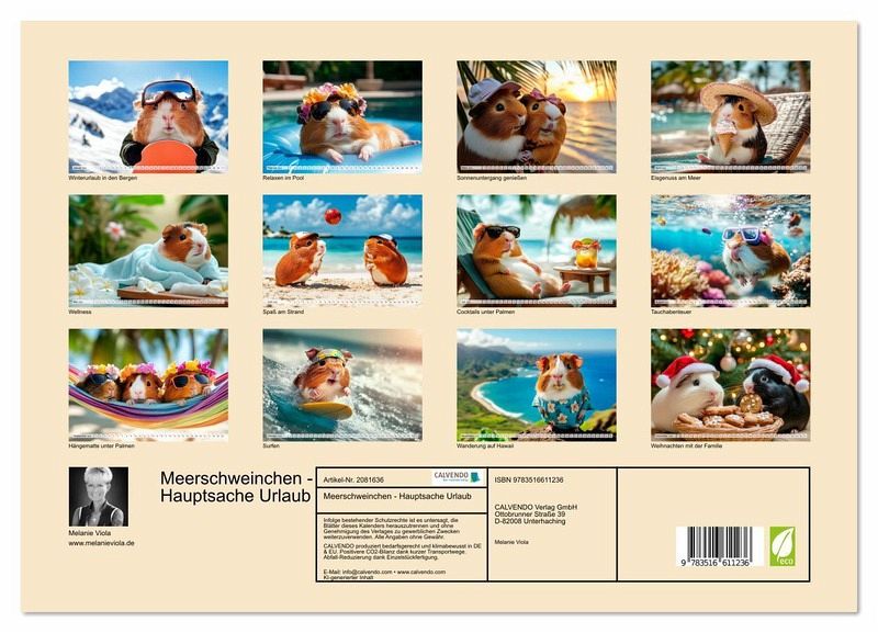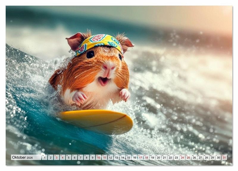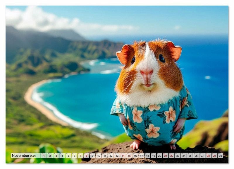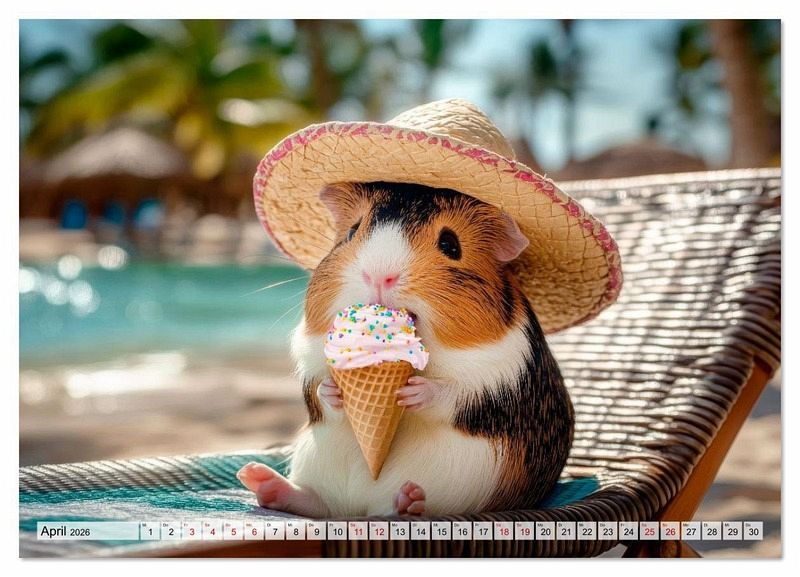 Erlebe niedliche Meerschweinchen, die entspannt am Strand liegen, in den Bergen wandern, Cocktails trinken oder in einer Hängematte dösen. Die Szenen wurden liebevoll und fantasievoll mit künstlicher Intelligenz erschaffen. Jeden Monat ein neues, witziges und charmantes Motiv, das garantiert ein Lächeln auf dein Gesicht zaubert. Ob als Geschenk für Tierliebhaber, KI-Fans oder einfach für dich selbst; dieser Kalender ist ein fröhlicher Begleiter durch das ganze Jahr.