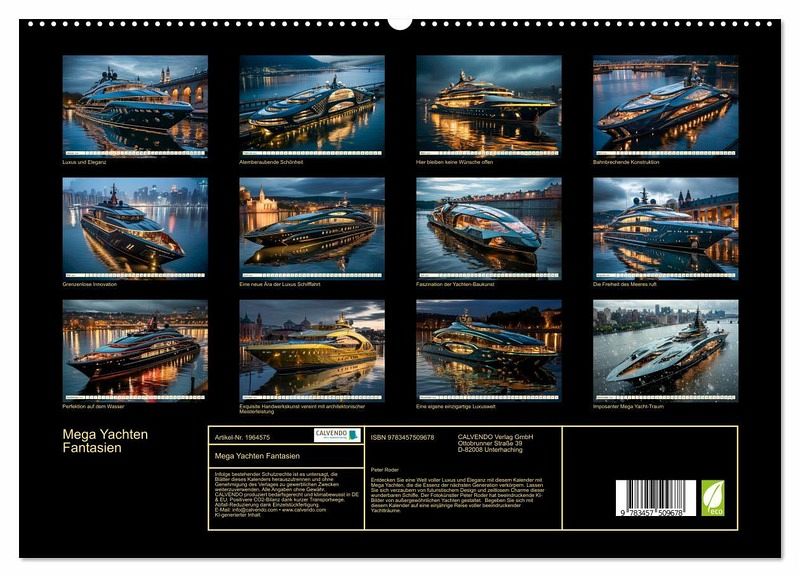 Entdecken Sie eine Welt voller Luxus und Eleganz mit diesem Kalender mit Mega Yachten, die die Essenz der nächsten Generation verkörpern. Lassen Sie sich verzaubern von futuristischem Design und zeitlosem Charme dieser wunderbaren Schiffe. Der Fotokünstler Peter Roder hat beeindruckende KI-Bilder von außergewöhnlichen Yachten gestaltet. Begeben Sie sich mit diesem Kalender auf eine einjährige Reise voller beeindruckender Yachtträume.