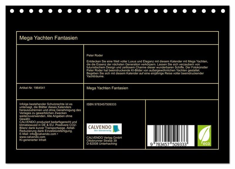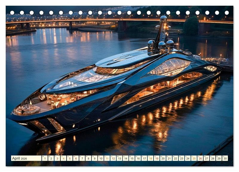 Entdecken Sie eine Welt voller Luxus und Eleganz mit diesem Kalender mit Mega Yachten, die die Essenz der nächsten Generation verkörpern. Lassen Sie sich verzaubern von futuristischem Design und zeitlosem Charme dieser wunderbaren Schiffe. Der Fotokünstler Peter Roder hat beeindruckende KI-Bilder von außergewöhnlichen Yachten gestaltet. Begeben Sie sich mit diesem Kalender auf eine einjährige Reise voller beeindruckender Yachtträume.