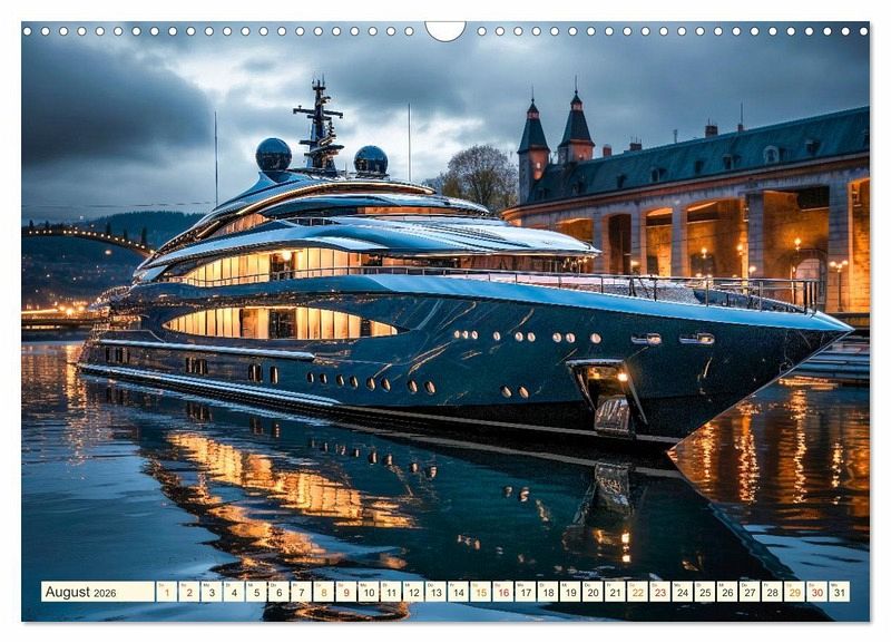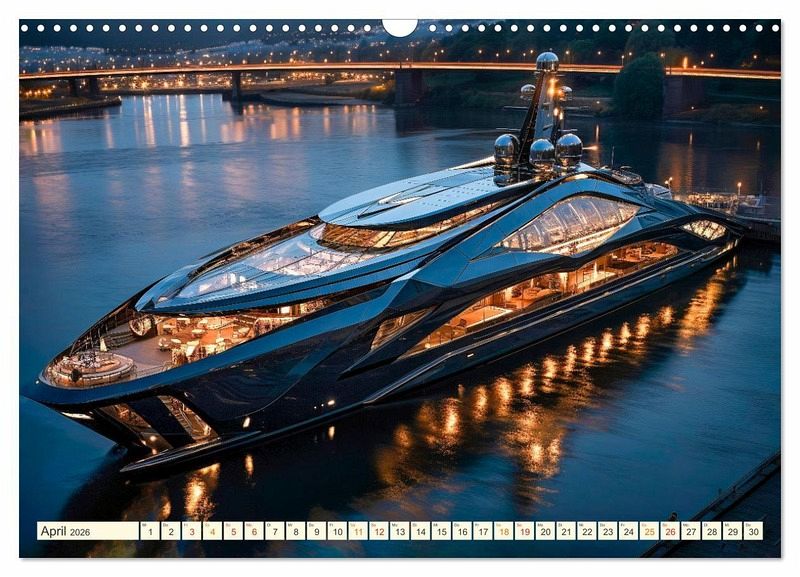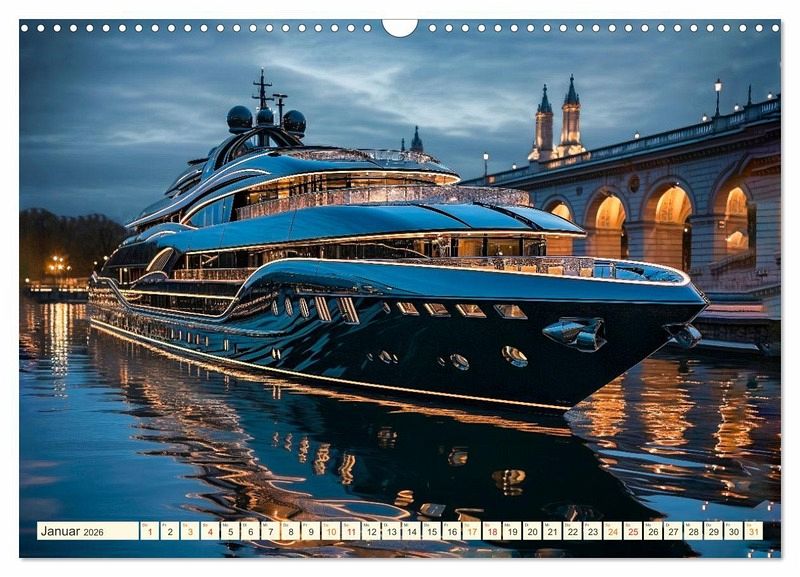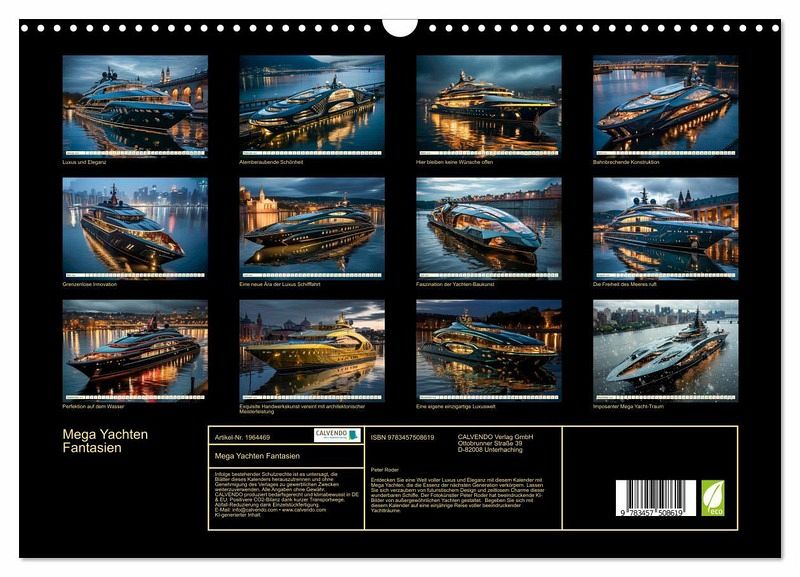 Entdecken Sie eine Welt voller Luxus und Eleganz mit diesem Kalender mit Mega Yachten, die die Essenz der nächsten Generation verkörpern. Lassen Sie sich verzaubern von futuristischem Design und zeitlosem Charme dieser wunderbaren Schiffe. Der Fotokünstler Peter Roder hat beeindruckende KI-Bilder von außergewöhnlichen Yachten gestaltet. Begeben Sie sich mit diesem Kalender auf eine einjährige Reise voller beeindruckender Yachtträume.