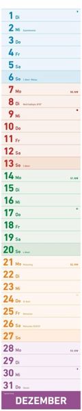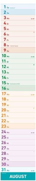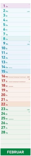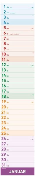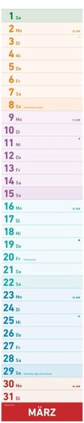 Extragroßes Format: Ca. 18×98 cm besonders viel Platz für Termine, Notizen und Erinnerungen Übersichtlich gestaltet: Farblich voneinander abgesetzte Wochen für schnelle Orientierung Praktische Extras: Mit Ferienterminen für DE/AT/CH im deutschsprachigen Kalendarium Hochwertige Qualität: Gedruckt auf Papier aus nachhaltiger Forstwirtschaft, FSC-zertifiziert, hergestellt in Deutschland Einfache Handhabung: Stabile Ringbindung zum bequemen Umblättern und einfachen Aufhängen