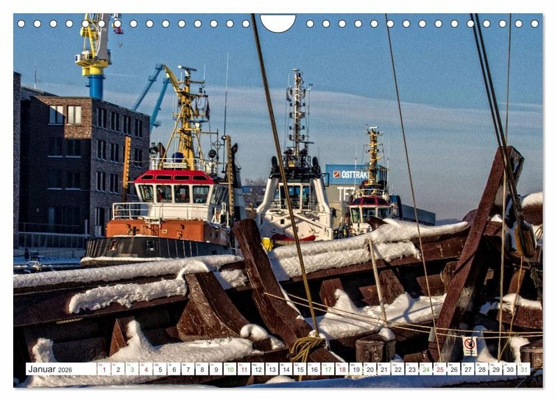 Januar: Blick von der Hansekogge Wissemara auf die Hafenschlepper im verschneiten Wismarer Alten Hafen