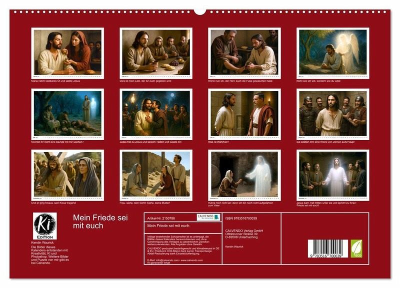 Dieser Kalender beginnt mit der Salbung in Bethanien - ein stilles Zeichen der Hingabe, das den Weg Jesu durch die Heilige Woche eröffnet. Mithilfe von KI entstanden Bilder, die zwischen fotorealistischer Klarheit und gemäldeartiger Tiefe wechseln und so eine besondere Atmosphäre schaffen. Szene für Szene entfaltet sich der Weg vom Abendmahl über das Kreuz bis hin zur Auferstehung. Ein Begleiter durchs Jahr, der Glauben und moderne Bildkunst miteinander verbindet und zum stillen Betrachten einlädt.