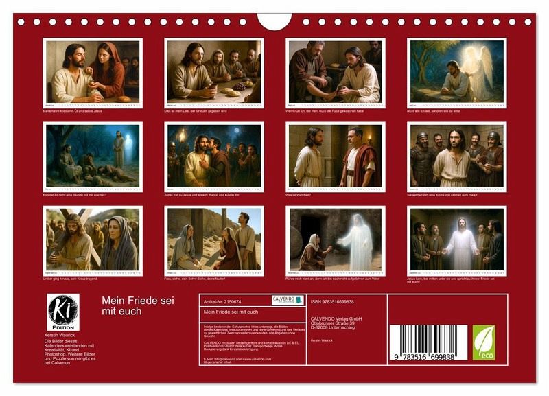 Dieser Kalender beginnt mit der Salbung in Bethanien - ein stilles Zeichen der Hingabe, das den Weg Jesu durch die Heilige Woche eröffnet. Mithilfe von KI entstanden Bilder, die zwischen fotorealistischer Klarheit und gemäldeartiger Tiefe wechseln und so eine besondere Atmosphäre schaffen. Szene für Szene entfaltet sich der Weg vom Abendmahl über das Kreuz bis hin zur Auferstehung. Ein Begleiter durchs Jahr, der Glauben und moderne Bildkunst miteinander verbindet und zum stillen Betrachten einlädt.