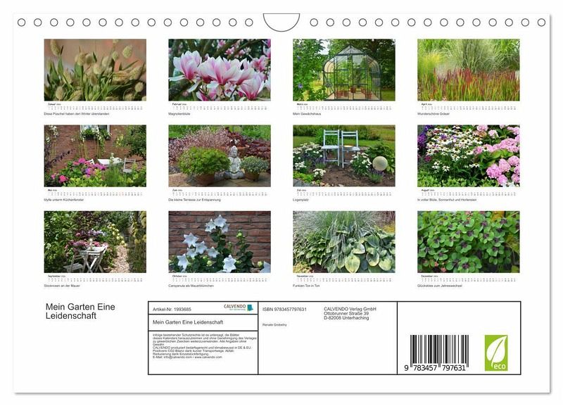 QUALITÄT - Hochwertiger Fotokalender mit 12 wunderschönen Motiven auf lichtbeständigem Bilderdruckpapier, robuste Spiralbindung mit Aufhängebügel.NACHHALTIG - deutliche Abfallreduzierung durch bedarfsgerechte Einzelstückfertigung, umweltfreundliches FSC-zertifiziertes Papier, Produktion in Deutschland, klimabewusste Logistik.PERFEKTES GESCHENK - Kalender für Freunde und Familie, für Kinder und Erwachsene, jung und alt, zu Weihnachten, Geburtstag oder zwischendurch.VIELFALT - Bildkalender in verschiedenen Formaten, z.B. DIN A5, DIN A4, DIN A3 sowie DIN A2. Ob Naturmotiv, Gemälde oder Fotos, ideal für ein persönliches Wohlfühlambiente.Ich liebe meinen Garten zu jeder Jahreszeit von Autor(in): Renate Grobelny