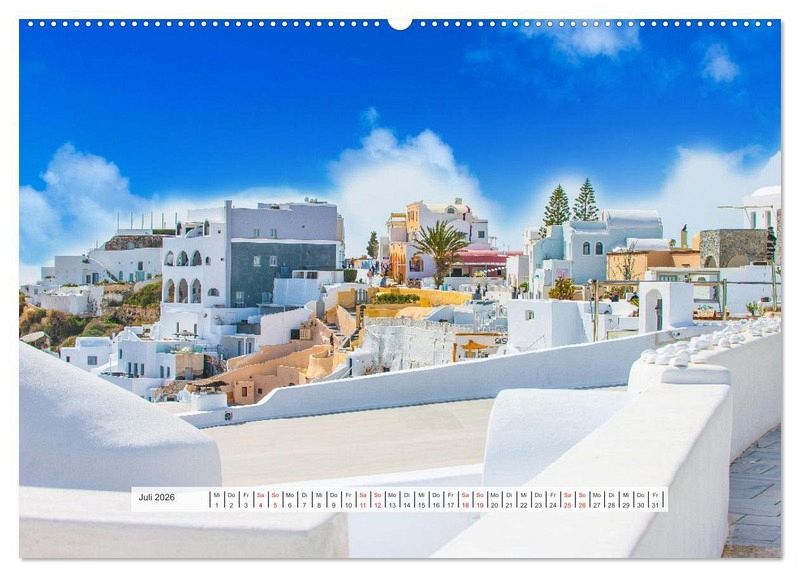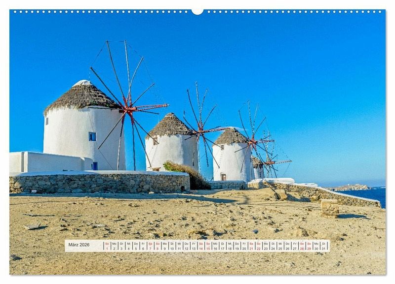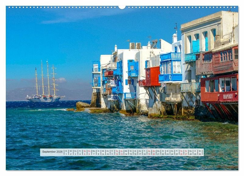Der Wandkalender mit griechischen Inseln und schönen Fotomotiven auf den griechischen Inseln, zeigt Kreta, Rhodos, Mykonos, Kanal von Korinth, Hafen von Milos und Santorini.