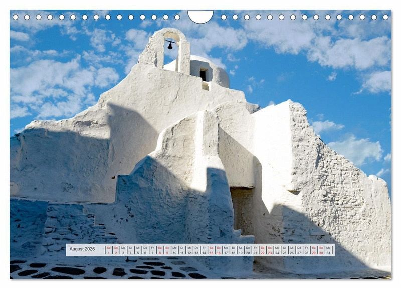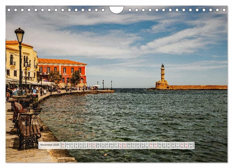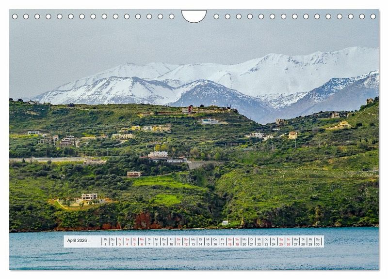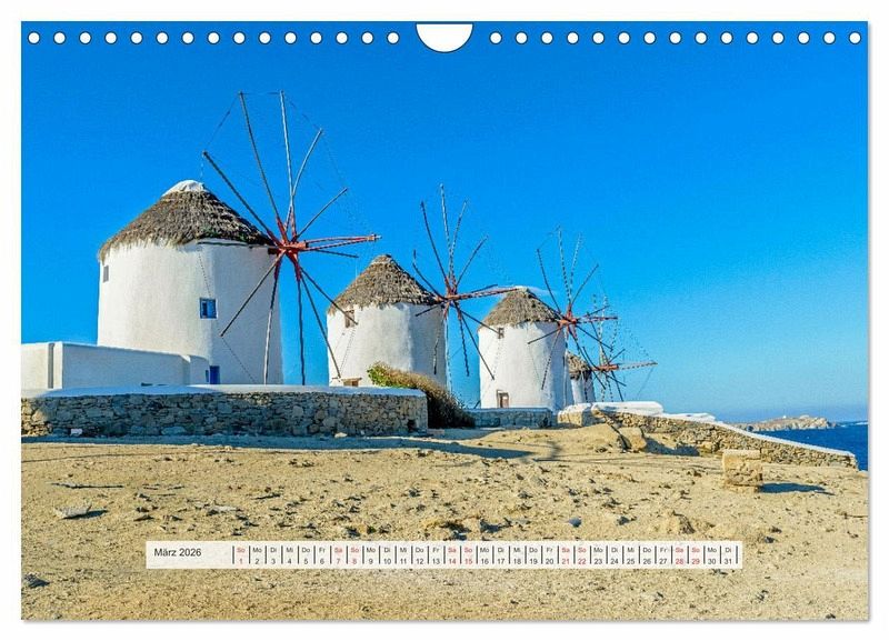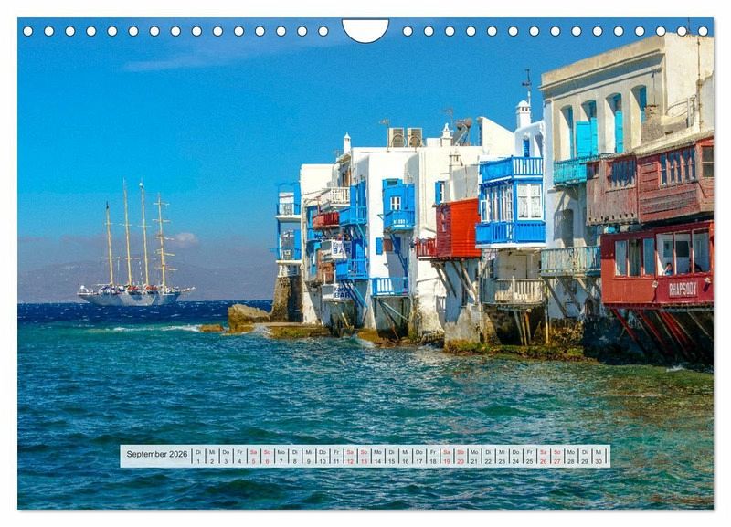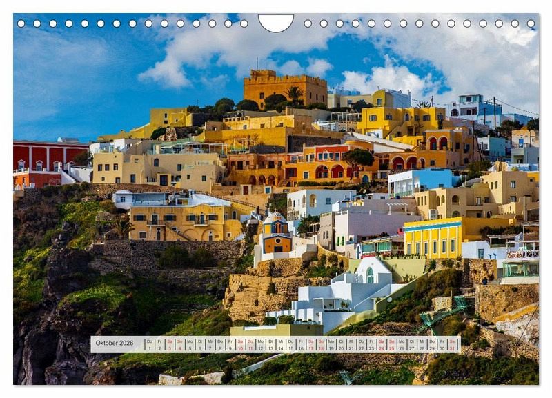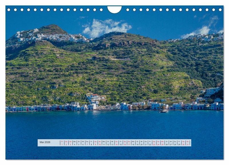 Der Wandkalender mit griechischen Inseln und schönen Fotomotiven auf den griechischen Inseln, zeigt Kreta, Rhodos, Mykonos, Kanal von Korinth, Hafen von Milos und Santorini.