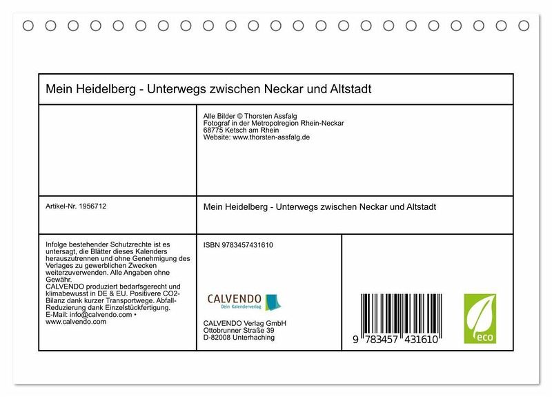 QUALITÄT - Hochwertiger Fotokalender mit 12 wunderschönen Motiven auf lichtbeständigem Bilderdruckpapier, robuste Spiralbindung.NACHHALTIG - deutliche Abfallreduzierung durch bedarfsgerechte Einzelstückfertigung, umweltfreundliches FSC-zertifiziertes Papier, Produktion in Deutschland, klimabewusste Logistik.PERFEKTES GESCHENK - Kalender für Freunde und Familie, für Kinder und Erwachsene, jung und alt, zu Weihnachten, Geburtstag oder zwischendurch.VIELFALT - Bildkalender in verschiedenen Formaten, z.B. DIN A5, DIN A4, DIN A3 sowie DIN A2. Ob Naturmotiv, Gemälde oder Fotos, ideal für ein persönliches Wohlfühlambiente.Heidelberg, die charmante Stadt am Neckar, vereint Geschichte, Kultur und Natur auf einzigartige Weise. von Autor(in): Thorsten Assfalg