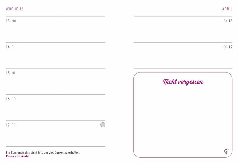 PLANUNG: Eine Doppelseite je Kalenderwoche sowie Monatsübersichten mit viel Platz für Notizen