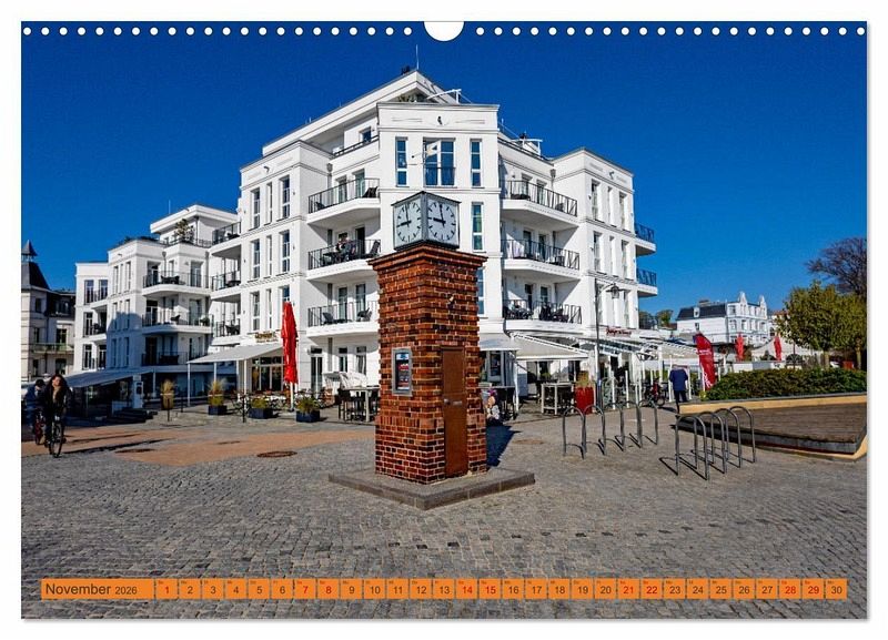 November: Blick auf moderne Baukunst an der Strandpromenade mit dem Bansiner Uhrturm