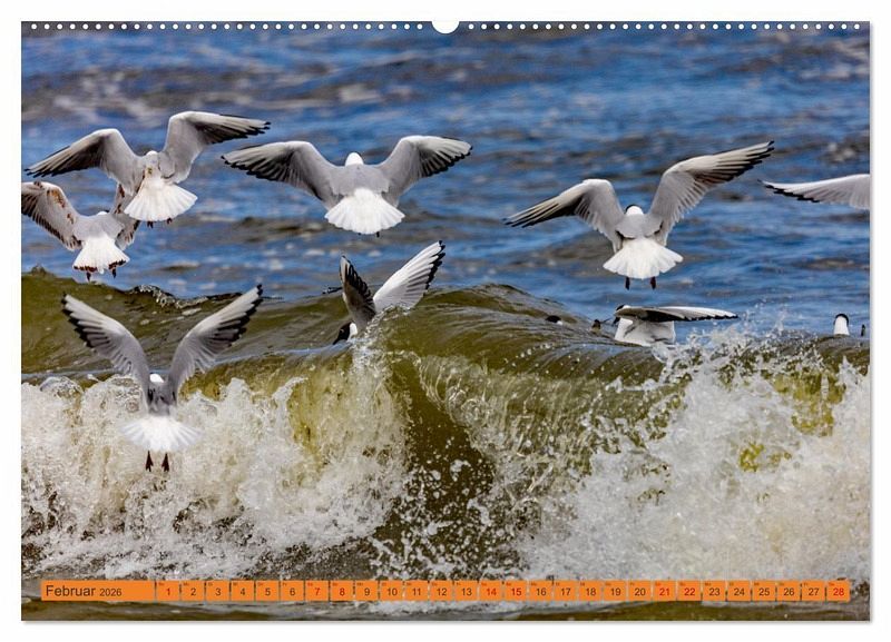 Februar: Wellen reitende Lachmöwen am Ostseestrand von Heringsdorf