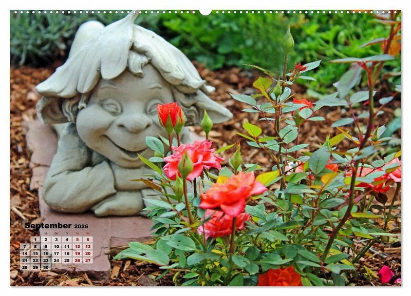 September: Der Wichtel in den Rosen liegt, er träumt als wäre er verliebt.