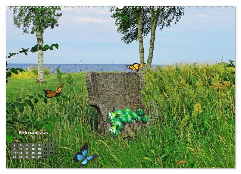 Februar: Die frechen Raupen im Sessel liegen, ach könnten sie doch bald als Schmetterling fliegen.