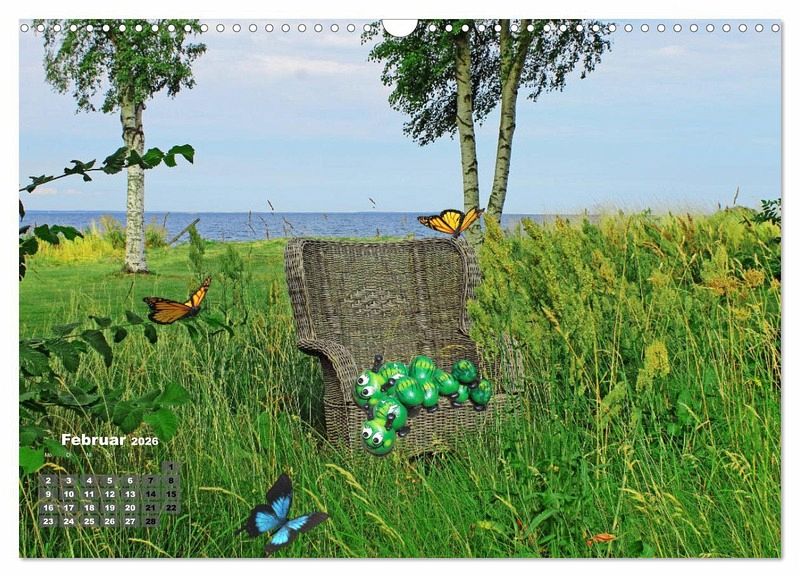 Februar: Die frechen Raupen im Sessel liegen, ach könnten sie doch bald als Schmetterling fliegen.