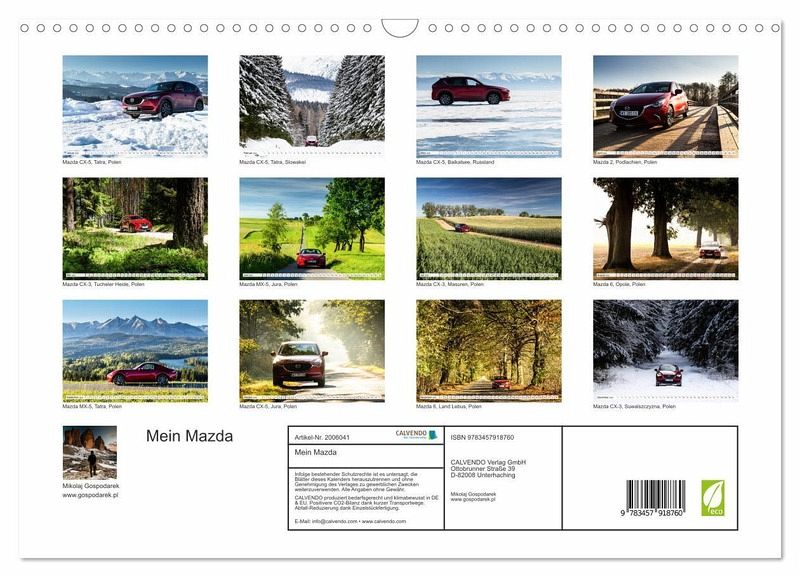 QUALITÄT - Hochwertiger Fotokalender mit 12 wunderschönen Motiven auf lichtbeständigem Bilderdruckpapier, robuste Spiralbindung mit Aufhängebügel.NACHHALTIG - deutliche Abfallreduzierung durch bedarfsgerechte Einzelstückfertigung, umweltfreundliches FSC-zertifiziertes Papier, Produktion in Deutschland, klimabewusste Logistik.PERFEKTES GESCHENK - Kalender für Freunde und Familie, für Kinder und Erwachsene, jung und alt, zu Weihnachten, Geburtstag oder zwischendurch.VIELFALT - Bildkalender in verschiedenen Formaten, z.B. DIN A5, DIN A4, DIN A3 sowie DIN A2. Ob Naturmotiv, Gemälde oder Fotos, ideal für ein persönliches Wohlfühlambiente.Ein unvergessliches Erlebnis mit Mazda! Fahren Sie mit! von Autor(in): Gospodarek Mikolaj