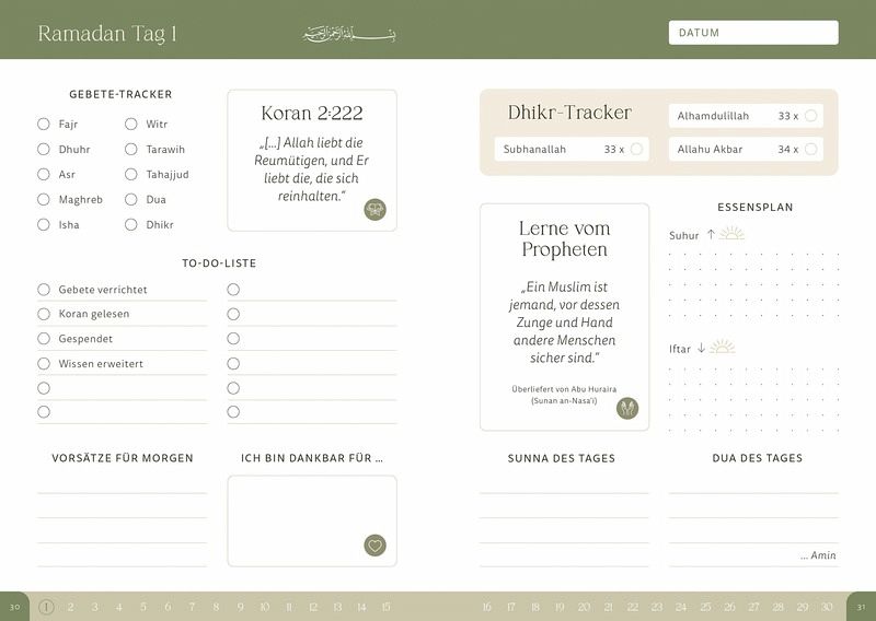 Das Original! Entdecke Jennahs neuen Ramadanplaner, deinen wertvollen Begleiter für diesen heiligen Monat! Vertiefe deine Verbindung zu Allah mit Tagesplänen, Rezepten, Journal-Seiten und Reflexionen. Auf zwei praktisch gestalteten Seiten pro Tag erwarten dich Quizze, Rätsel und Übungen, die dein Wissen über den Islam vertiefen. Dieser Planer begleitet dich zu einem erfüllten und bewussten Ramadan-Erlebnis!