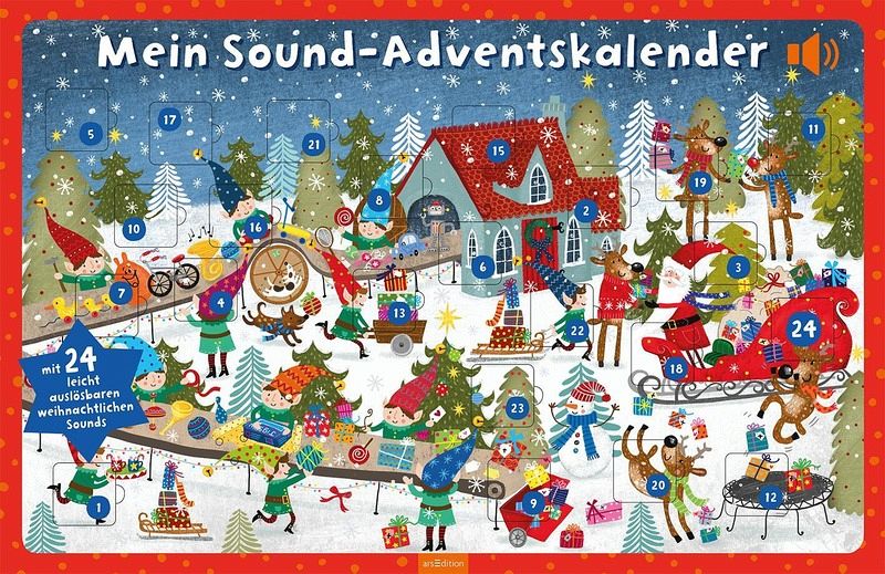 Interaktiver Wartezeitverkürzer: 24 Weihnachts-Sounds versüßen Kindern ab 2 Jahren mit stimmungsvollen Klängen die AdventszeitWeihnachtlicher Sound-Spaß: Mit leicht auslösbaren Sounds für kleine Kinderhände (Soundlänge: zwischen 21 und 55 Sekunden)Tolles Motiv: Auf dem kunterbunten Weihnachtswimmelbild lässt sich jeden Tag etwas Neues entdeckenDekorativer Hingucker: Extragroße, farbenfrohe Wanddeko (62 x 40,2 cm)Ton abschaltbar: Dank des praktischen An- und Ausschalters auf der Rückseite kann man die Sounds an- und ausschaltenBatterien auswechselbar: Die handelsüblichen Knopfzellenbatterien vom Typ LR 1130 mit je 1,5 V lassen sich problemlos auswechseln