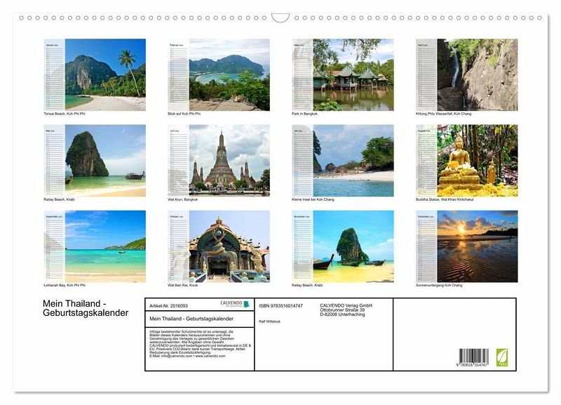 Abbildungen: Januar: Tonsai Beach, Koh Phi Phi Februar: Blick auf Koh Phi Phi März: Park in Bangkok April: Khlong Phlu Wasserfall, Koh Chang Mai: Railay Beach, Krabi Juni: Wat Arun, Bangkok Juli: Kleine Insel bei Koh Chang August: Buddha Statue, Wat Khao Khitchakut September: Lohlanah Bay, Koh Phi Phi Oktober: Wat Ban Rai, Korat November: Railay Beach, Krabi Dezember: Sonnenuntergang Koh Chang