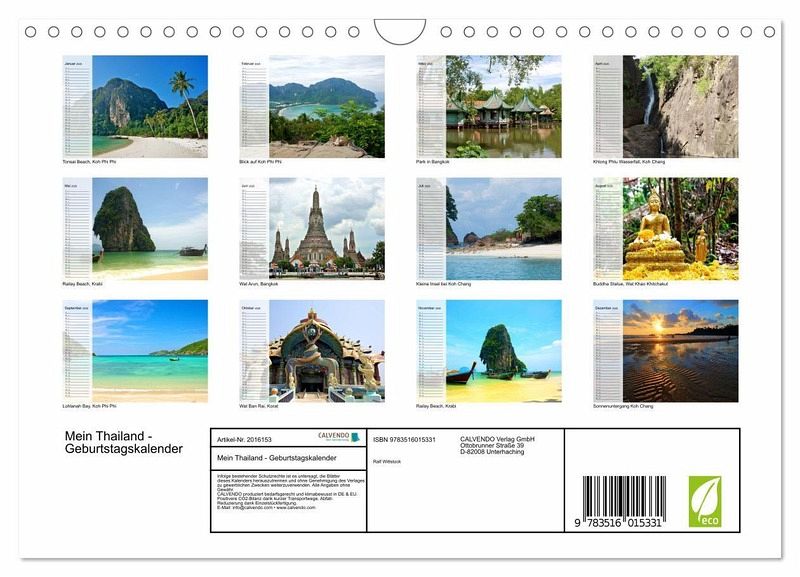 Abbildungen: Januar: Tonsai Beach, Koh Phi Phi Februar: Blick auf Koh Phi Phi März: Park in Bangkok April: Khlong Phlu Wasserfall, Koh Chang Mai: Railay Beach, Krabi Juni: Wat Arun, Bangkok Juli: Kleine Insel bei Koh Chang August: Buddha Statue, Wat Khao Khitchakut September: Lohlanah Bay, Koh Phi Phi Oktober: Wat Ban Rai, Korat November: Railay Beach, Krabi Dezember: Sonnenuntergang Koh Chang